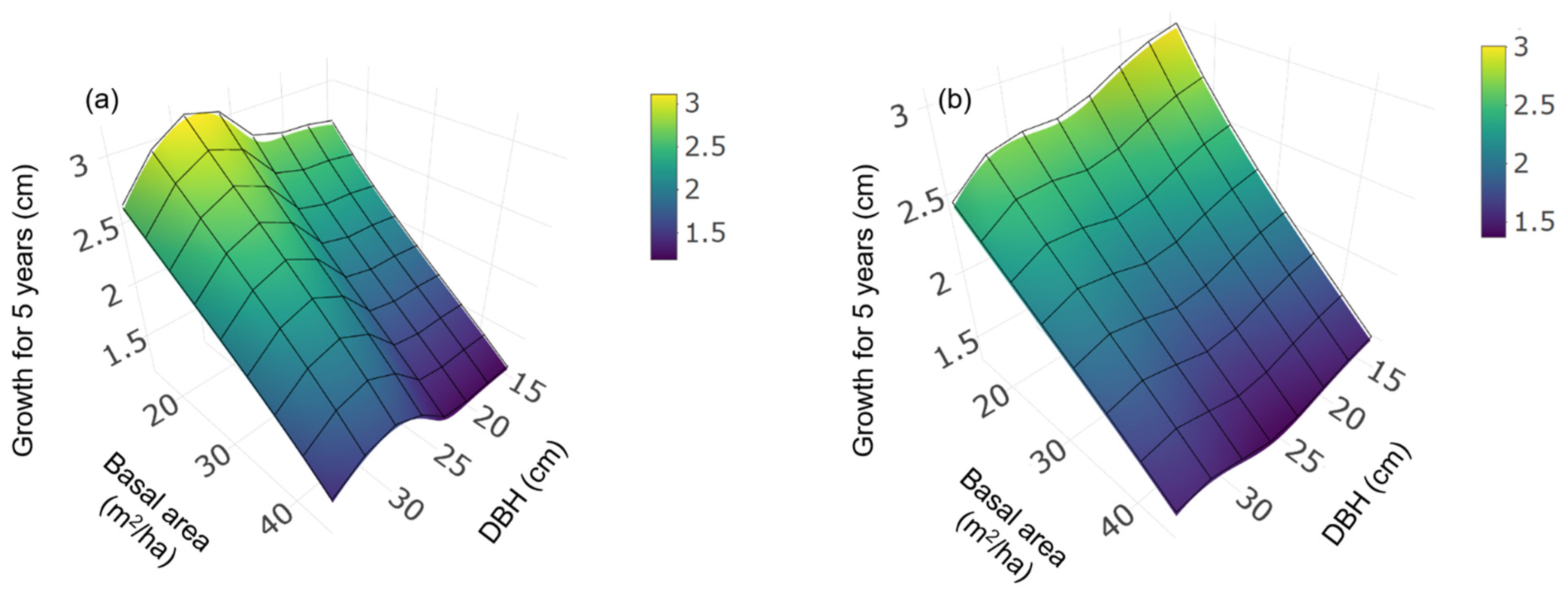 | Diameter at breast height (cm) | 20.77 ± 7.44 | 23.72 ± 7.47 | 25.95 ± 7.69 | 22.16 ± 6.77 | 24.56 ± 6.81 | 26.34 ± 7.08 |