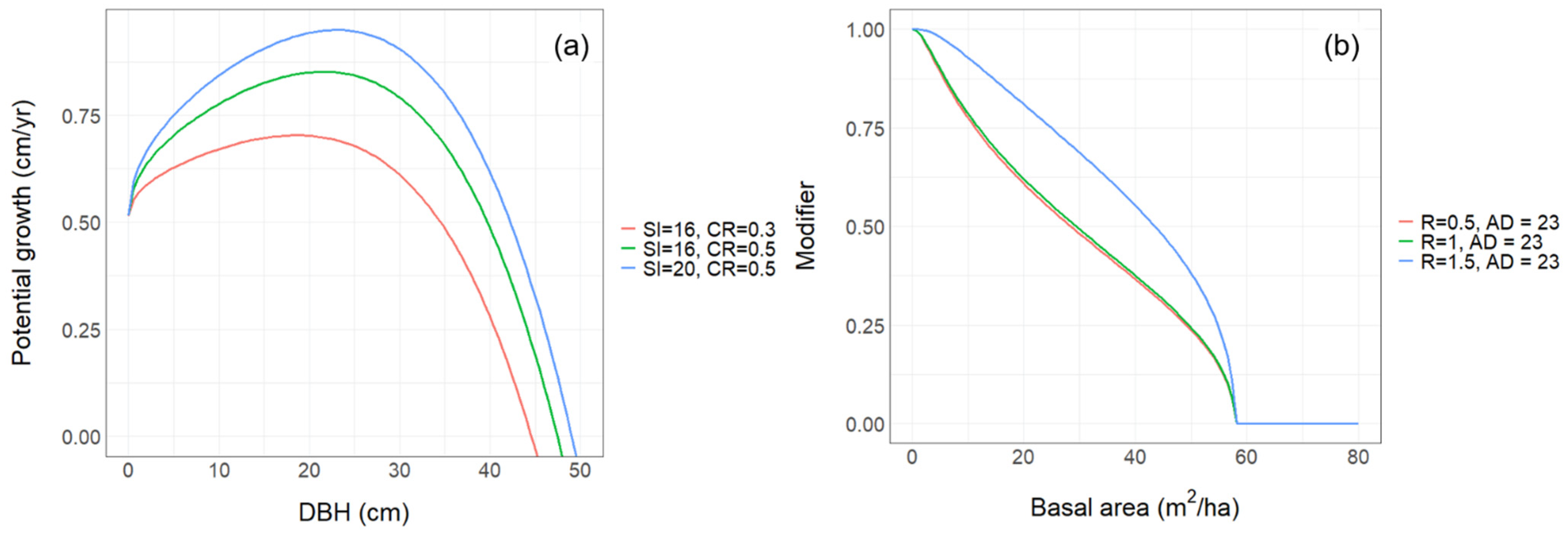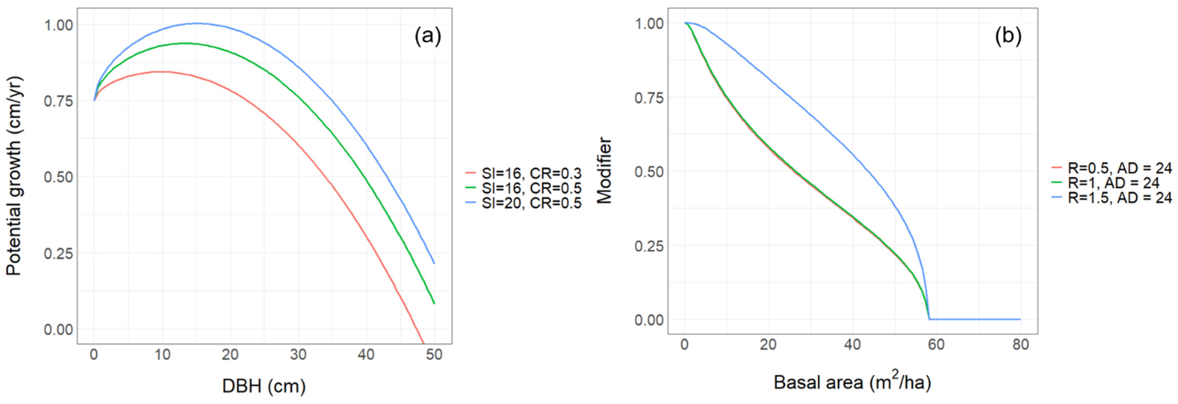 - Hahn, J.T.; Leary, R.A. Potential Diameter Growth Functions; USDA Forest Service; General Technical Report NC-49; U.S. Department of Agriculture, Forest Service, North Central Forest Experiment Station: St. Paul, MN, USA, 1979.