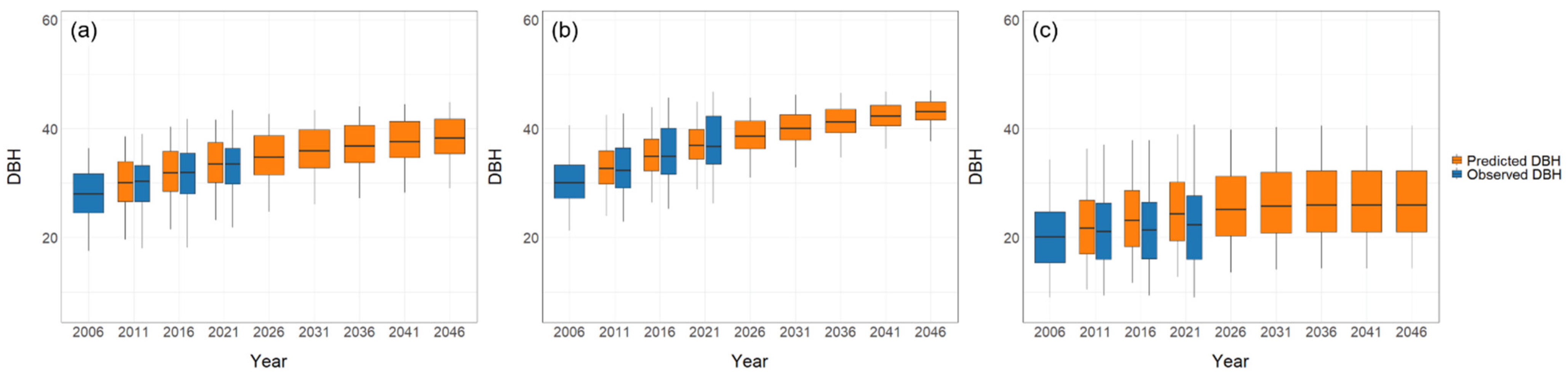 - Lu, J. Individual Tree Diameter Growth Modelling for Natural Secondary Forest in Changbai Mountains, Northeast China. Sci. Rep. 2024, 14, 18695. [Google Scholar] [CrossRef]