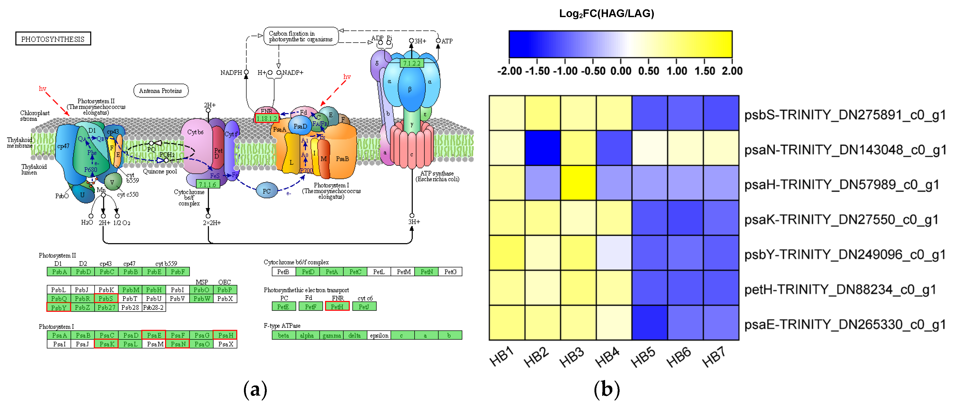 3.7. Analysis of DEGs Associated with Photosynthesis