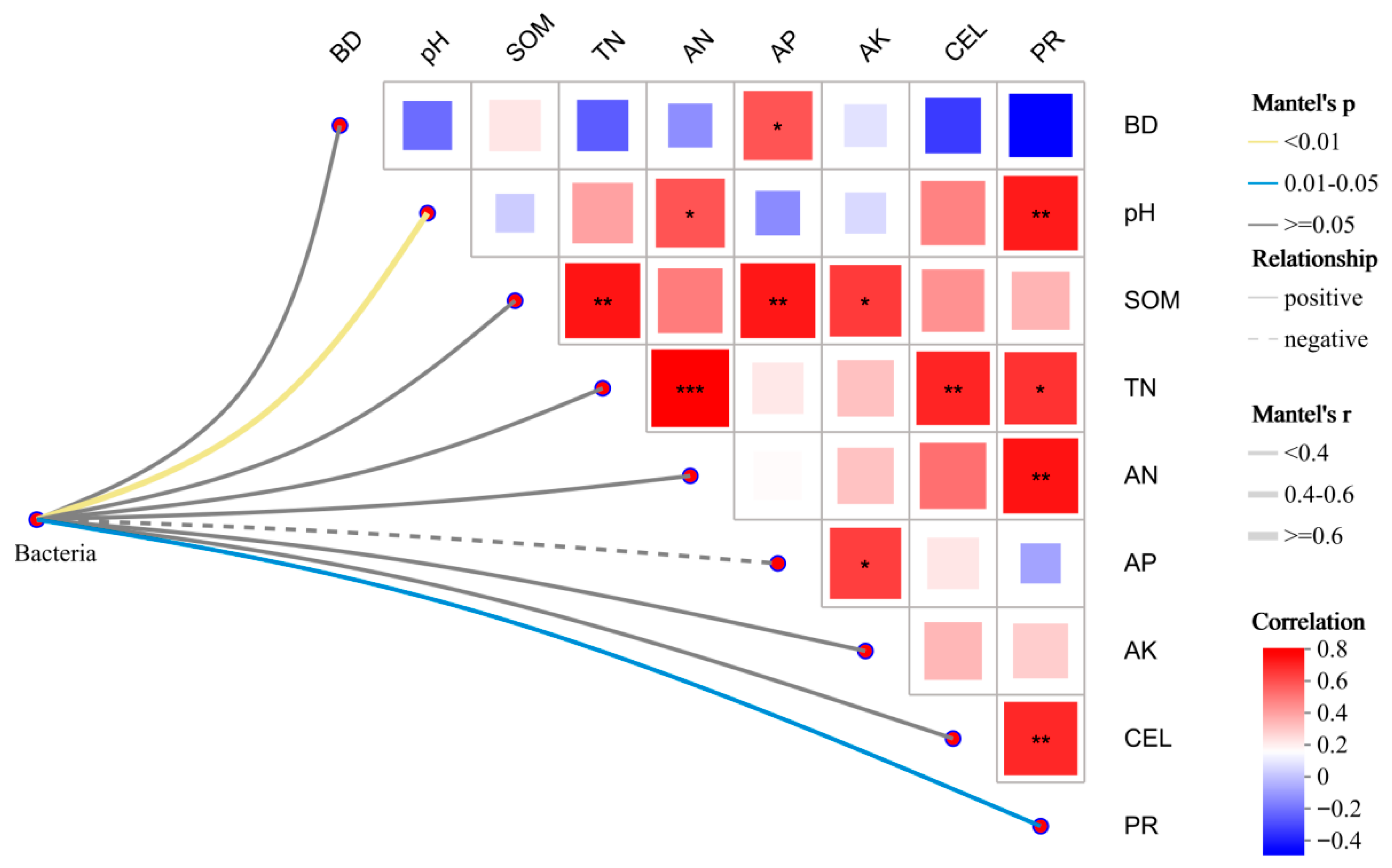 Treatments | BD (g/cm3) | pH | SOM (g/kg) | TN (g/kg) | AN (g/kg) | AP (mg/kg) | AK (mg/kg) | CEL (ug/g·h) | PR (ug/g·h) |