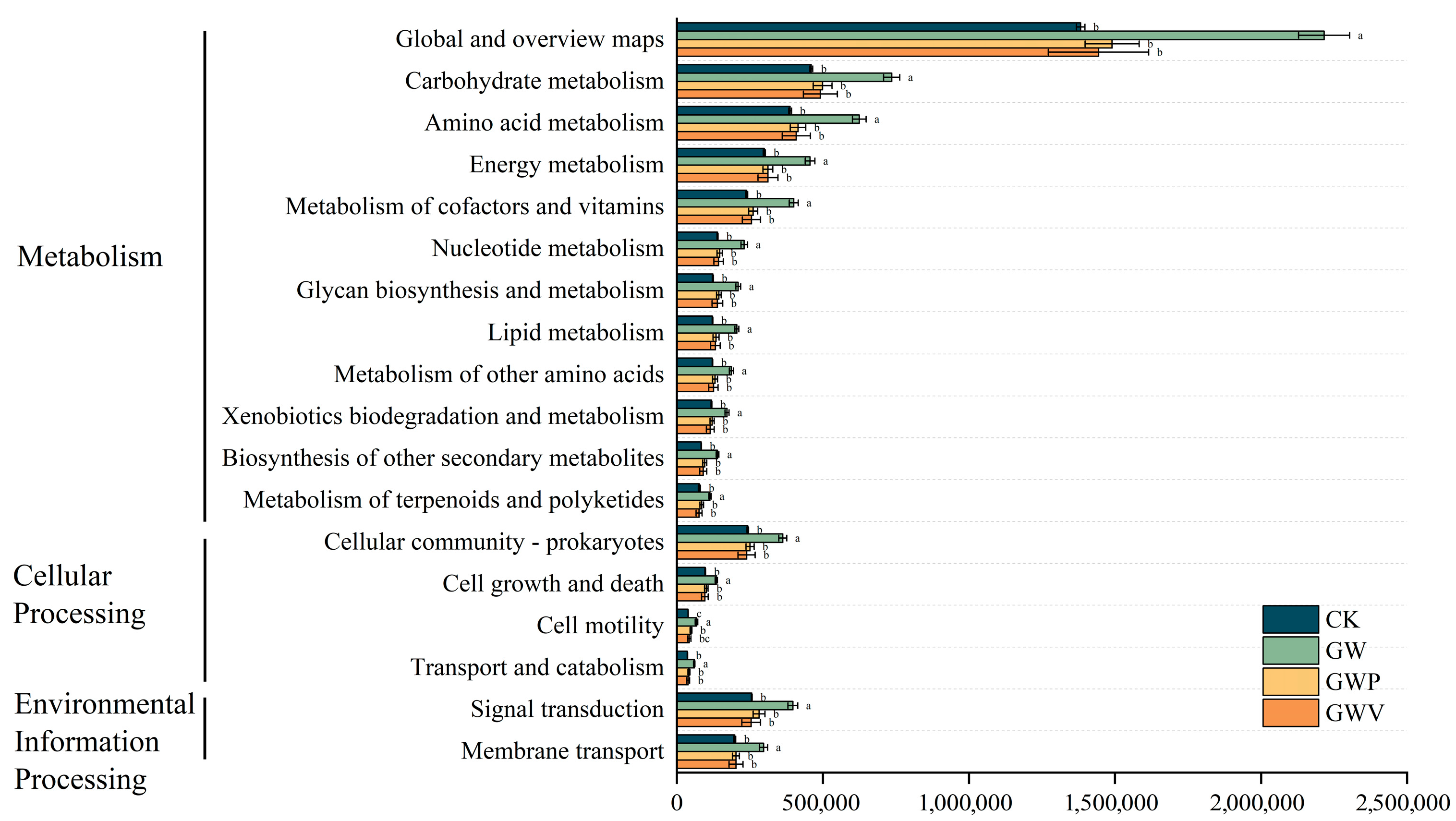 3.4. Response of Soil Bacterial Community Functional Gene Abundance to Mulching Practices