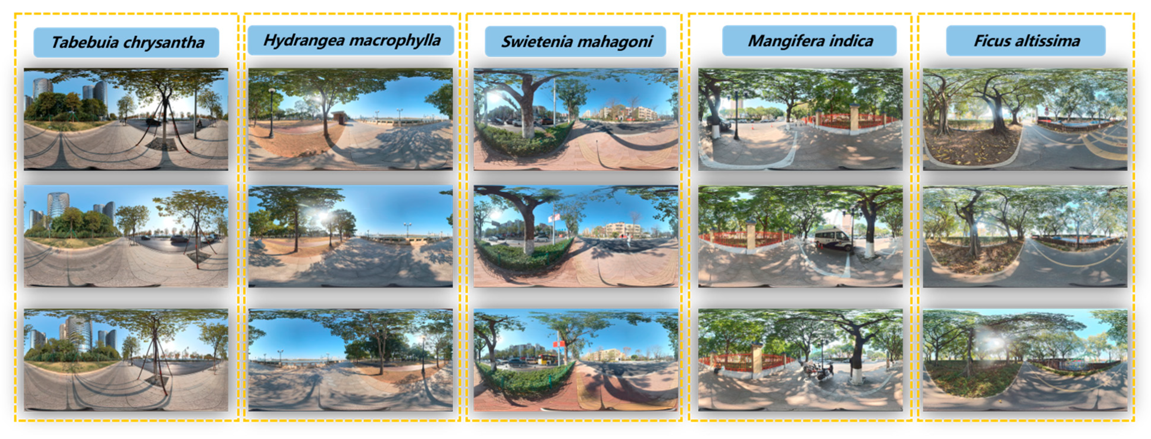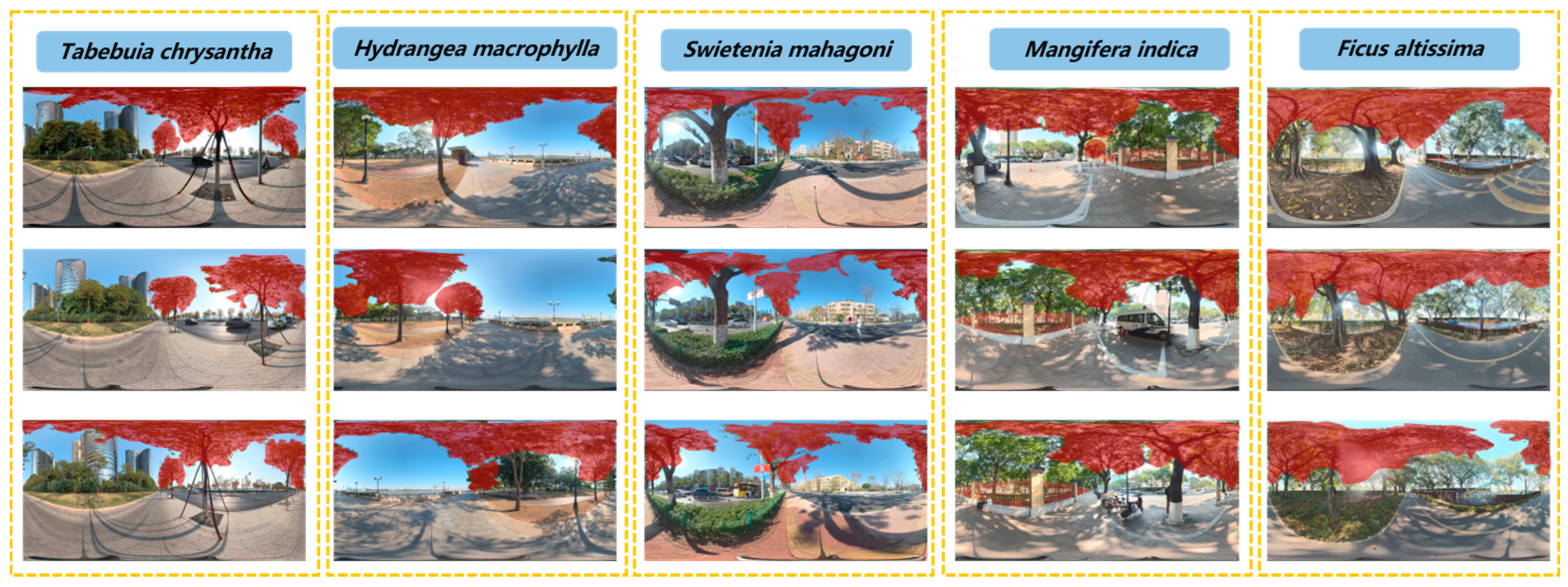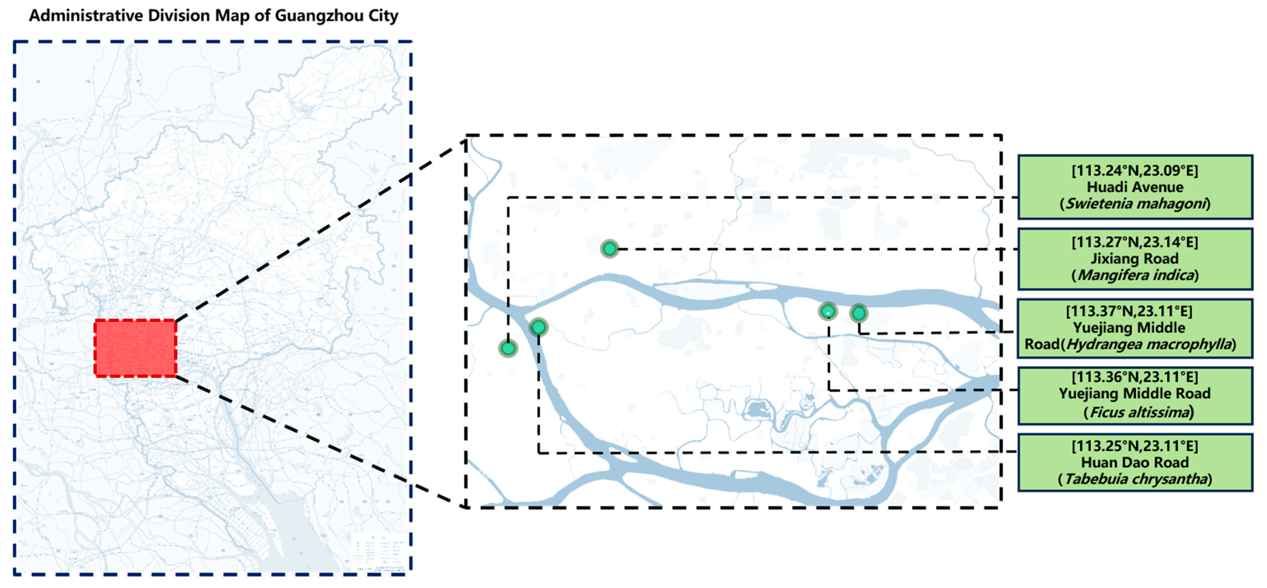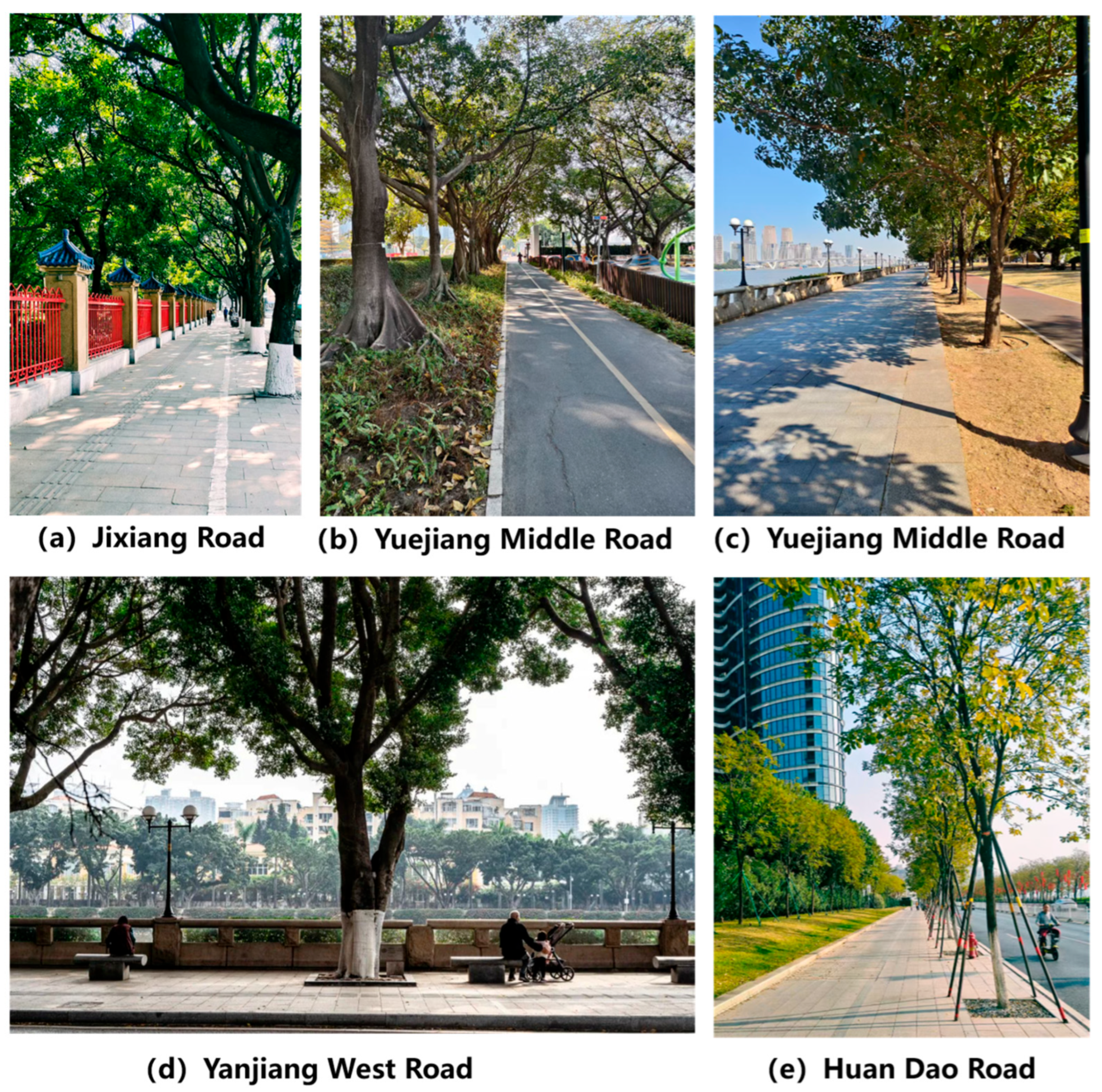 Figure 3): Huadi Avenue, Jixiang Road, Yuejiang Middle Road, Yuejiang Middle Road, and Huan Dao Road. Among them, a length of 500 m was selected for sampling, and the traffic flow on these streets is not very high, making them typical pedestrian walkways. The selection of tree species follows dual criteria, namely ecological representativeness, covering the main roadside tree species in subtropical cities, including evergreen broad-leaved trees (Ficus microcarpa), deciduous ornamental trees (Ulmus chinensis), economic fruit trees (mango trees), fast-growing trees (peach blossom trees), and small trees (purple hydrangeas), reflecting the diversity of canopy structure; Spatial distribution frequency: The selected street is in the top five combinations with the highest frequency of tree configuration patterns in high-density built-up areas.