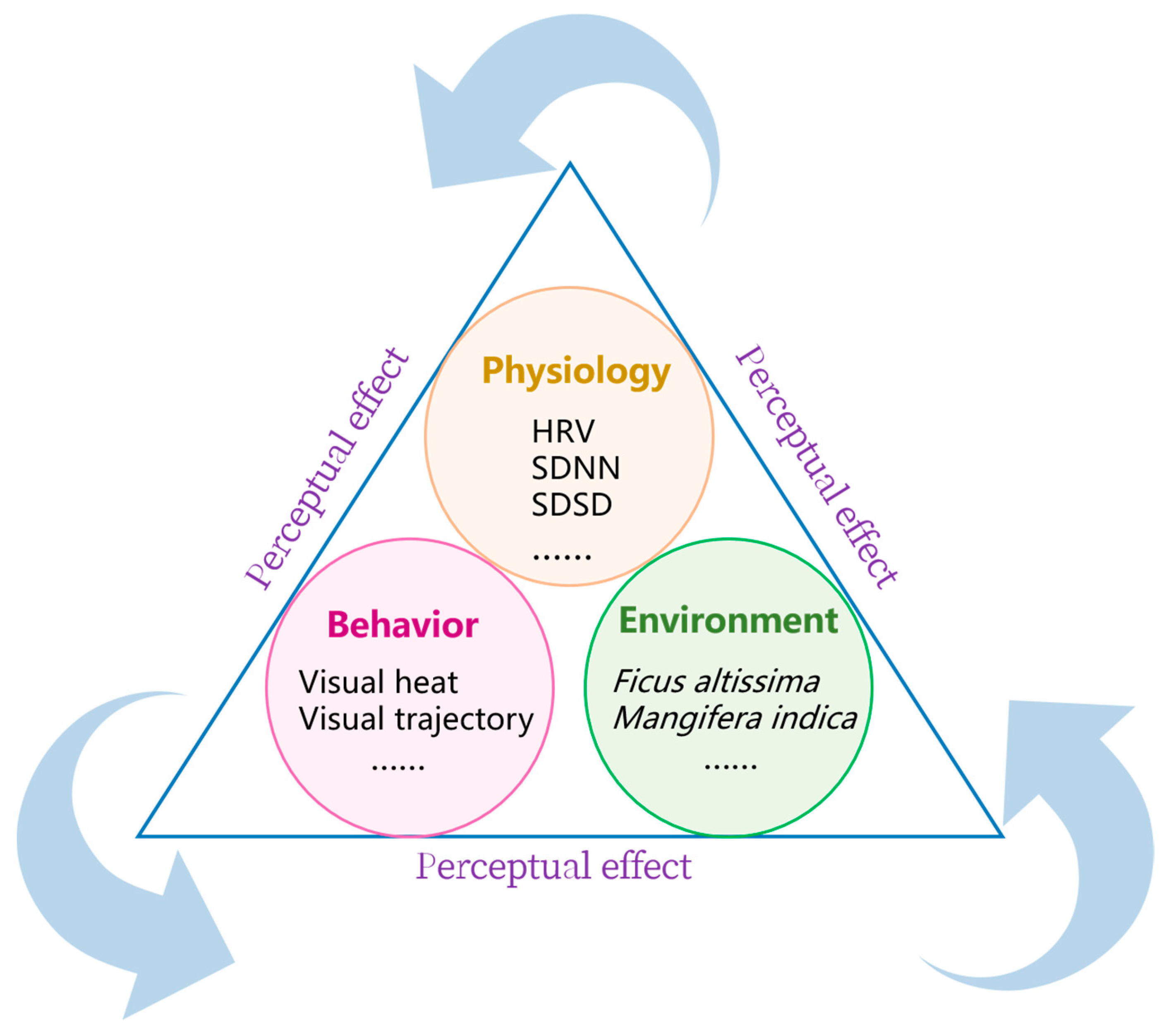 13], investigations focusing on street trees—linear landscape elements in urban public spaces—remain limited. This study transcends the constraints of conventional landscape assessment methodologies reliant on subjective questionnaires by establishing a tripartite “physiological-behavioral-environmental” coupling framework for analyzing the effects of canopy perception. The groundbreaking innovations are manifested in two dimensions: