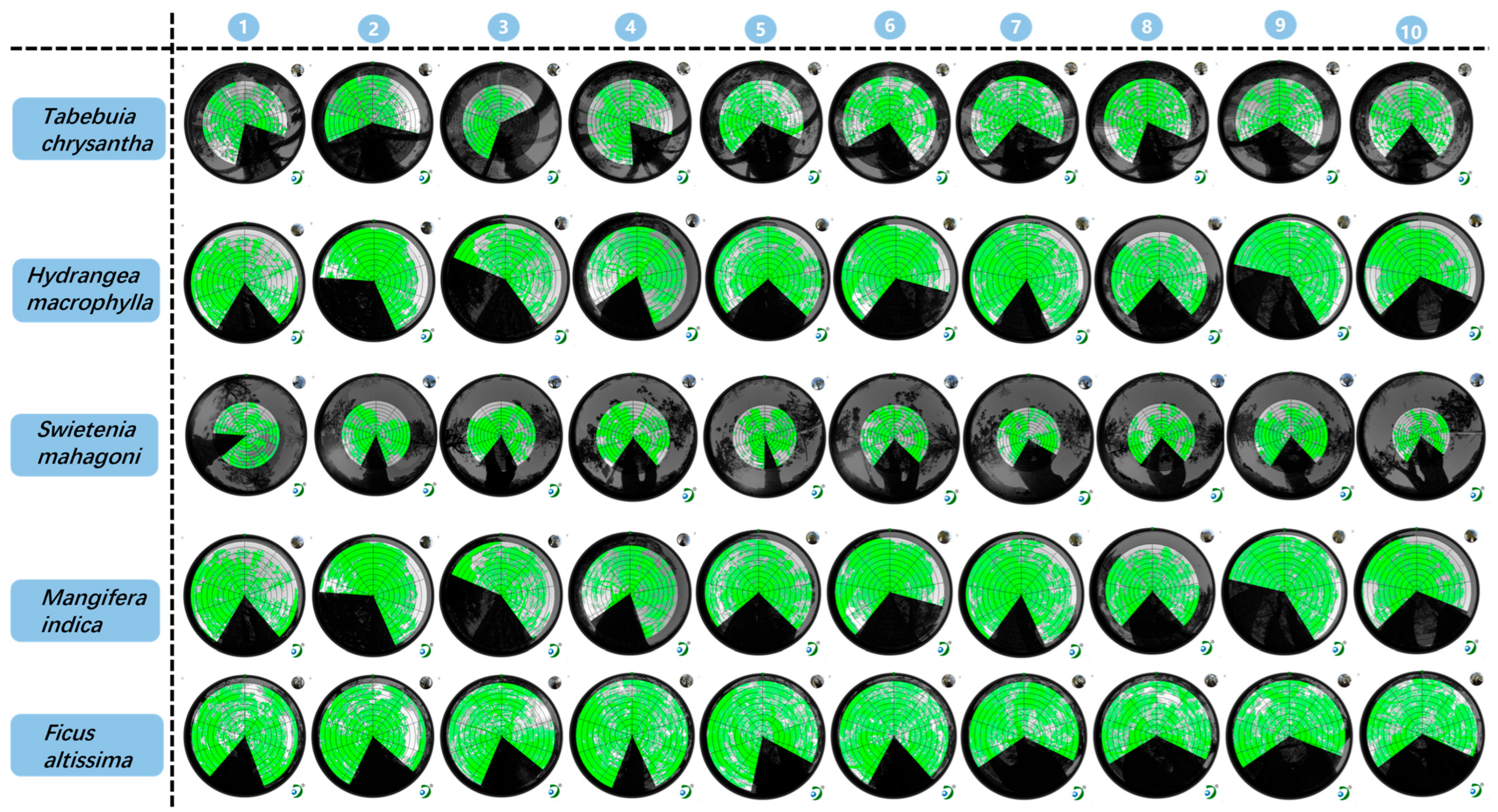 Hemispherical canopy images were acquired using a Sony ILCE-ZV10 camera equipped with a fisheye lens, with 10 standard trees selected from each street for photography, for a total of 50 images. The raw images underwent standardized processing through DJ-GC02 analysis software. The preprocessing phase entailed the following steps: first, geometric distortion correction was performed to eliminate lens edge deformation; second, illumination homogenization was implemented to reduce ambient light interference. Subsequently, canopy gap analysis was conducted. An adaptive threshold algorithm was applied to segment sky pixels (gaps) from leaf/branch pixels (non-gaps). The gap fraction distribution was statistically analyzed for each zenith angle (0°~90° at 10° intervals) and azimuth angle (0°~360°) (