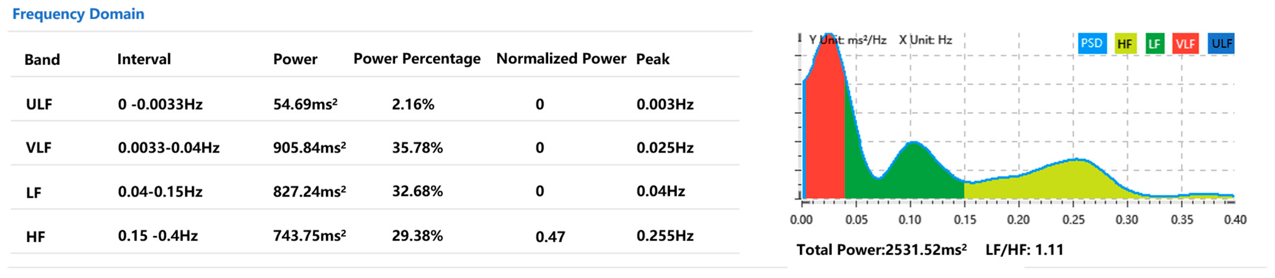 18]. In situations involving stress, the low-frequency component of HRV has been observed to undergo a relative increase during relaxation; parasympathetic nervous system excitation leads to a relative increase in the high-frequency component of HRV. Therefore, in this experiment, we assessed the mental stress state of subjects by comparing various HRV analysis metrics. Physiological data from all subjects were imported into ErgoLAB 3.0 software for analysis, with some preprocessing required prior to analysis.