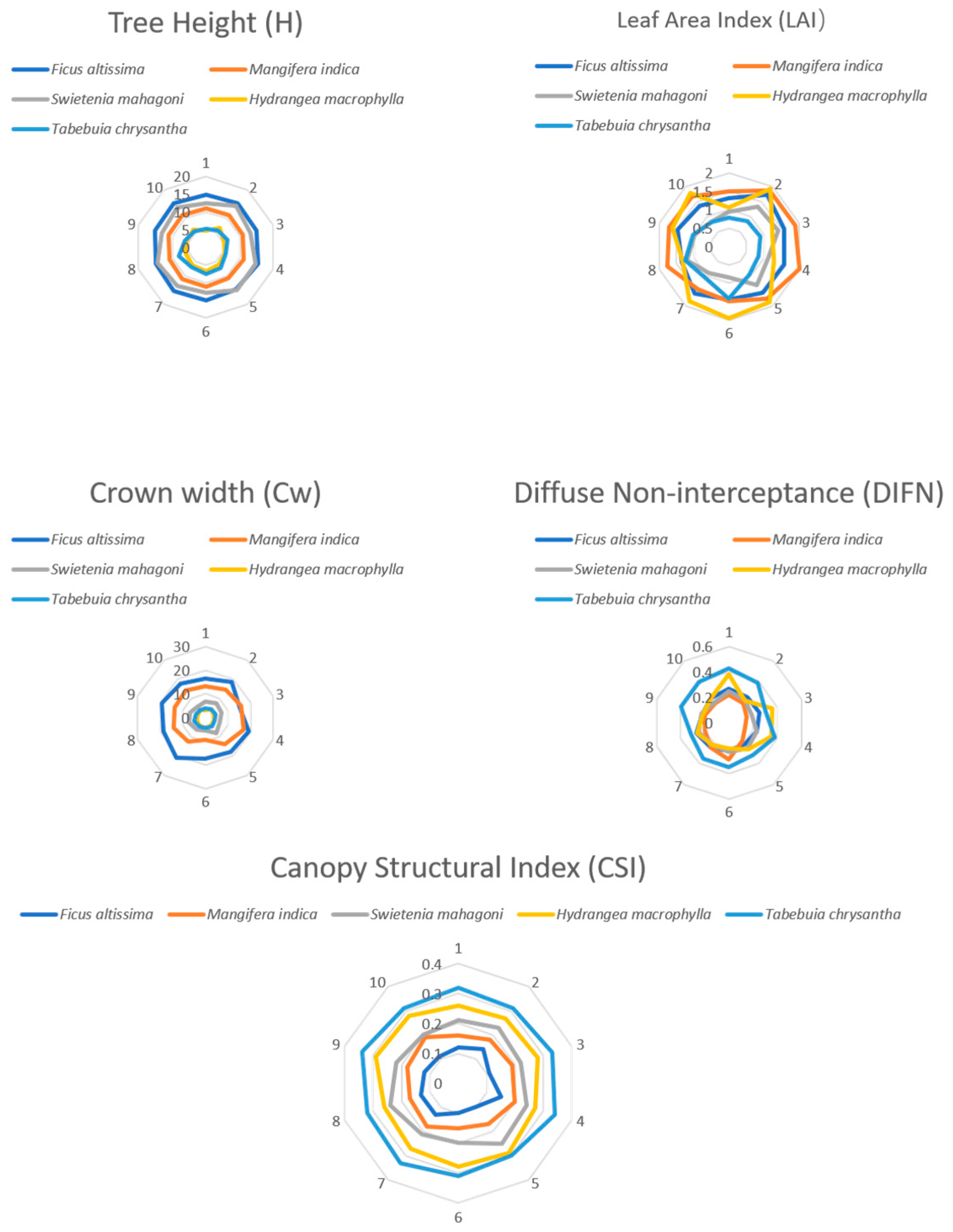 (1) Theoretical Innovation: This research introduces the Canopy Structural Index (CSI) as a standardized metric for quantifying crown spatial morphology. We developed a five-tier classification system (Levels 1–5) by integrating four critical canopy parameters—tree height, crown width, leaf area index (LAI), and Diffusion Non-interceptance—representing a seminal advancement in urban tree canopy characterization. (
