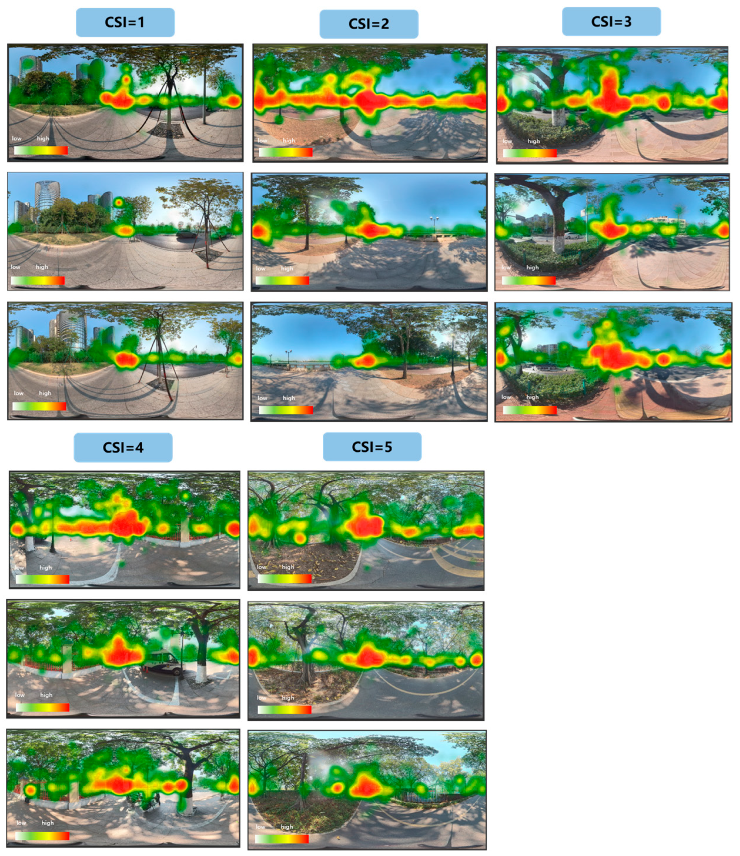 9] demonstrated through deep learning analysis that pedestrian perceived pleasure peaks at CLT levels of 20%–30%; values below 10% or above 50% may cause glare or visual monotony. Li et al. further supported this in VR eye-tracking experiments. They found that high canopy density significantly increased pupil diameter, suggesting an elevated visual load [