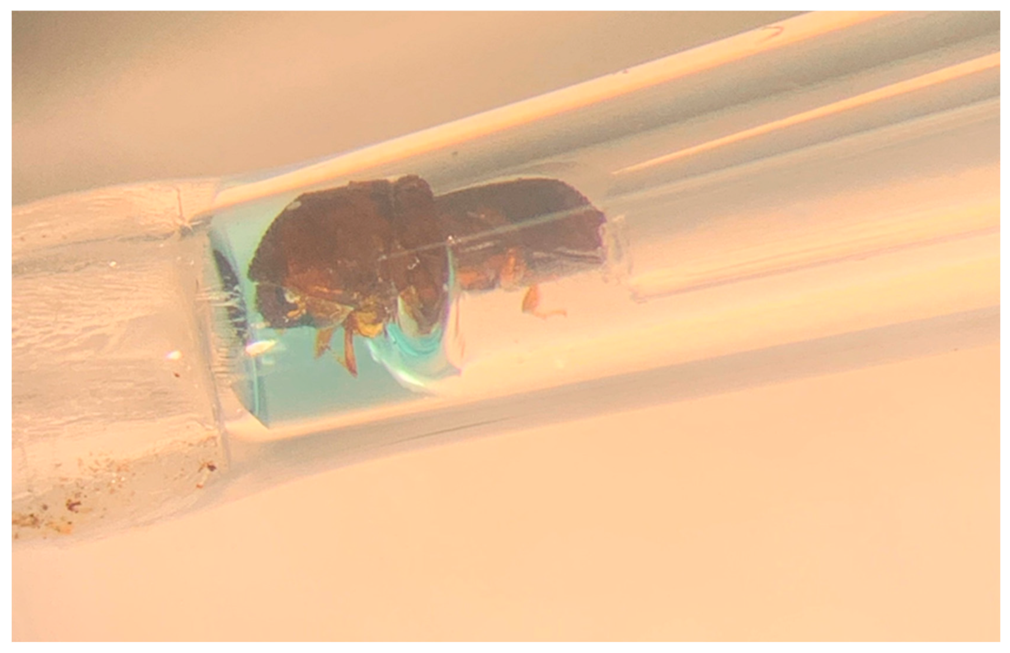 - Hollowell, H.; Rieske, L. Southern Pine Beetle-Specific RNA Interference Demonstrates no Effects on Non-Target Organisms. Msater’s Thesis, Department of Entomology, Univeristy of Kentucky, Lexington, KY, USA, 2021. [Google Scholar] [CrossRef]