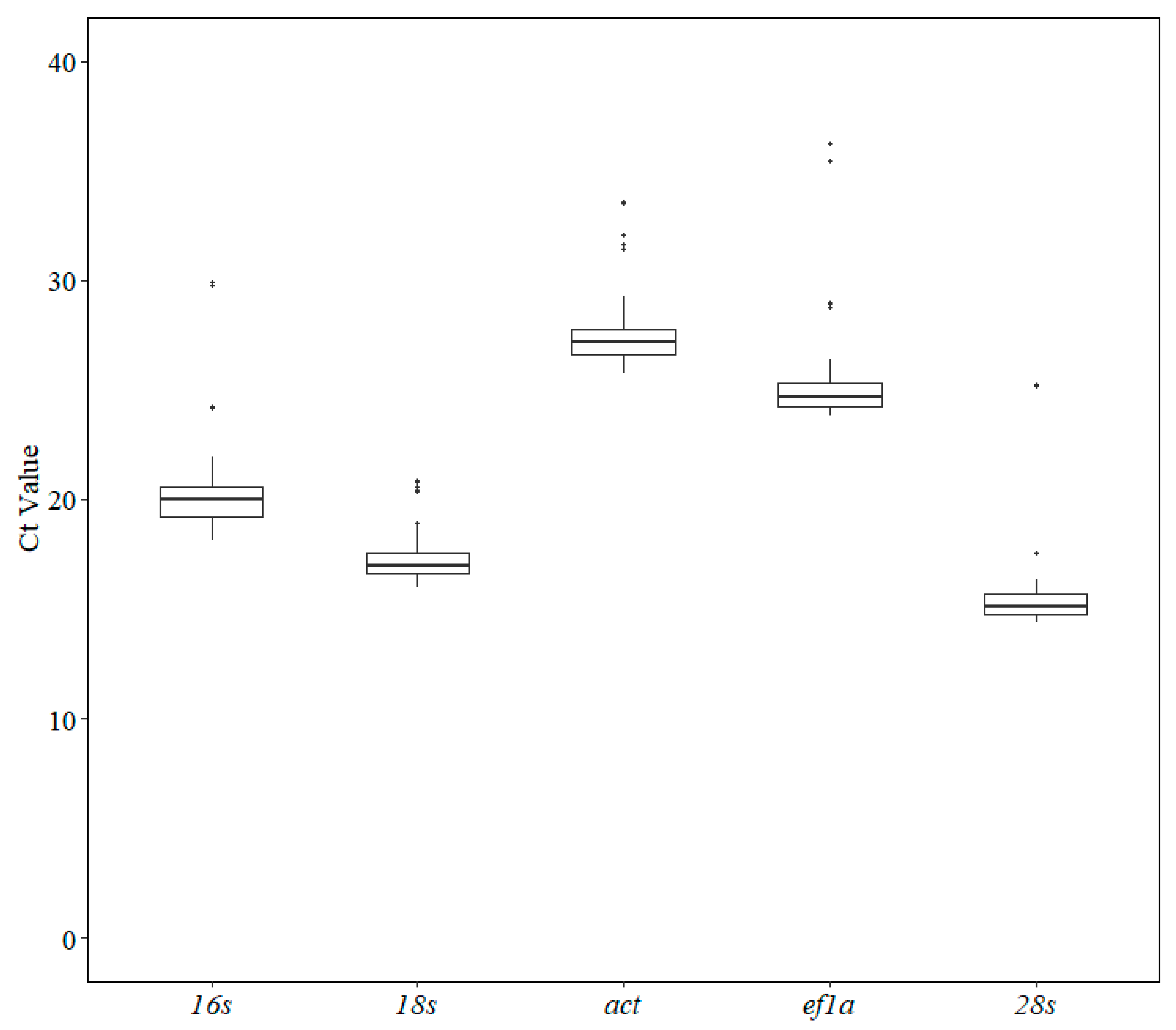 GeNorm | NormFinder | BestKeeper | delta-CT | Comprehensive | ||||||