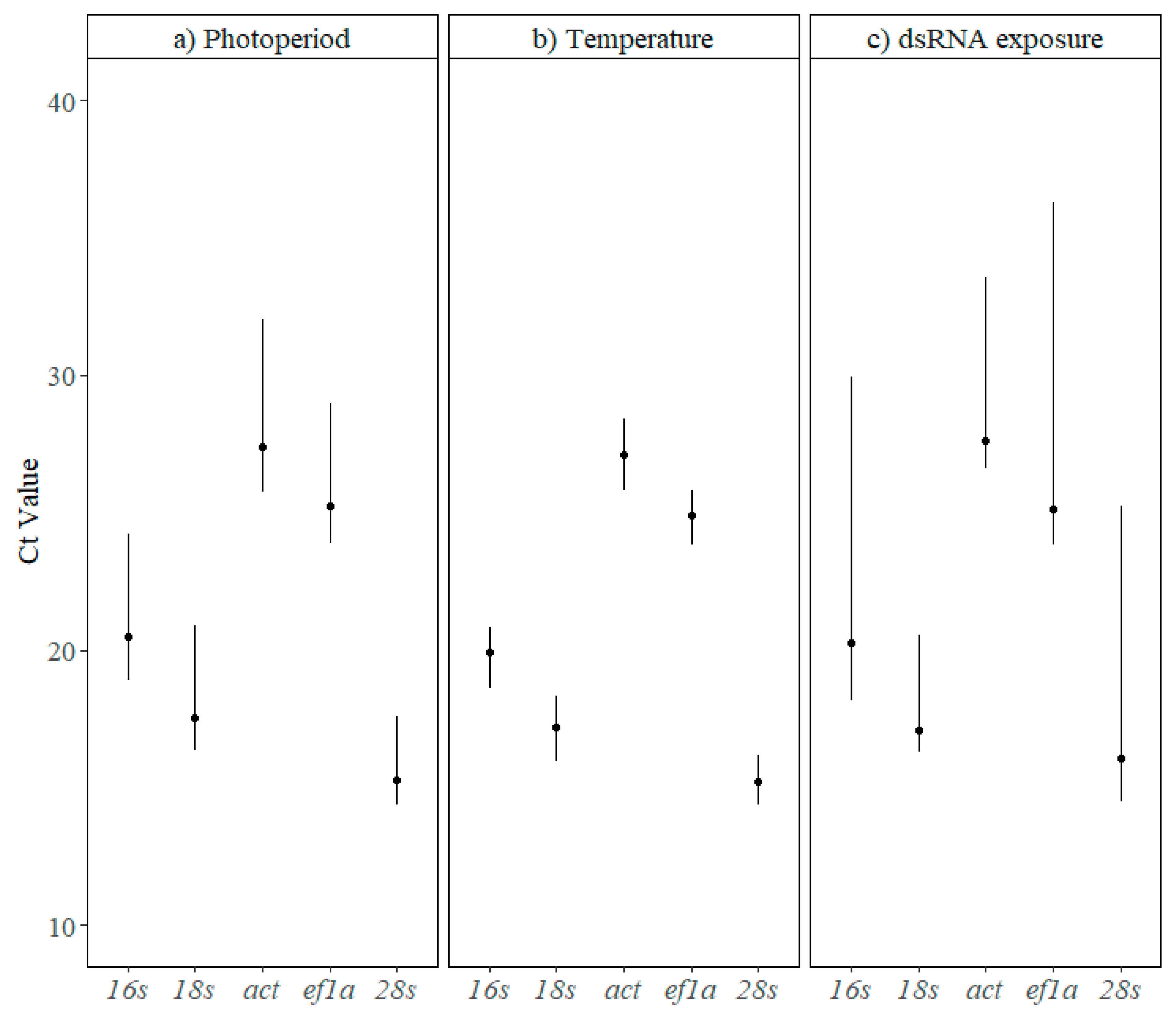 - Shi, X.Q.; Guo, W.C.; Wan, P.J.; Zhou, L.T.; Ren, X.L.; Ahmat, T.; Fu, K.Y.; Li, G.Q. Validation of reference genes for expression analysis by quantitative real-time PCR in Leptinotarsa decemlineata (Say). BMC Res. Notes 2013, 6, 93. [Google Scholar] [CrossRef] [PubMed]