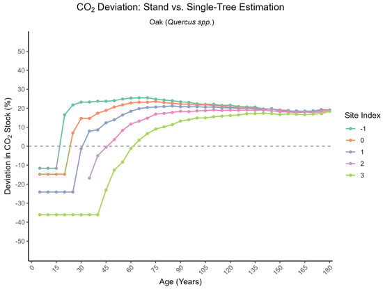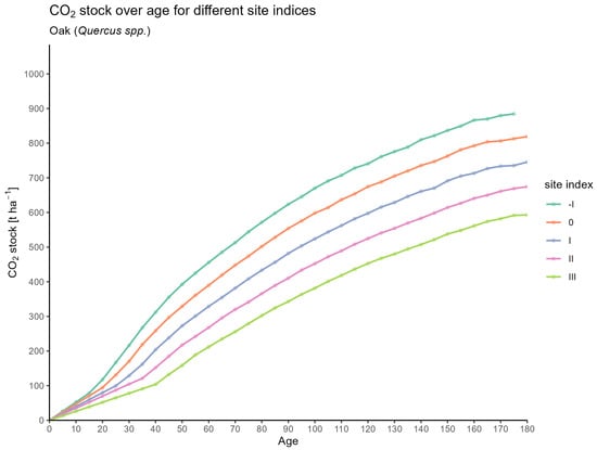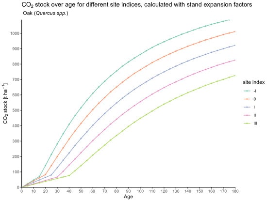 While in Figure 1 the stock was derived by scaling individual-tree estimates and stem numbers following Riedel and Kändler (2017) [18], Figure 4 presents results based on stand expansion factors according to Pretzsch (2009) [22]. Both approaches rely on the identical yield tables provided by Albert et al. (2024) [40], ensuring consistency of the underlying growth assumptions while allowing for a methodological comparison of tree-level versus stand-level upscaling. Figure 4 illustrates the accumulation of carbon dioxide () stock in tonnes per hectare (t ) over time (age in years) for oak (Quercus spec.).