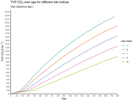 Figure 2 illustrates the cumulative (as TVP) stored in oak stands versus their age, differentiated by site quality. Five distinct lines, each representing a site index (from −I to III), show accumulation. Site Index −I (teal) represents the most productive site, accumulating over 2000 by 175 years. Site Index III (light green) is the least productive, accumulating just over 1000 over the same period. Generally, accumulation increases with age for all sites, with an initial slower growth followed by a more rapid increase. The difference in storage among the site indices becomes more pronounced as the trees age. For the assessment of additional climate mitigation effects, the TVP of managed forests appears to be of limited suitability, as the full TVP cannot be accumulated in the stand over the long term under a no-management scenario. To avoid potential misinterpretation, it should be clarified that the displayed TVP trajectory refers exclusively to managed stands based on the yield table assumptions of Albert et al., 2024 [40].