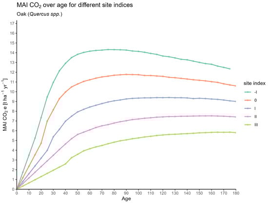 Figure 3 illustrates the mean annual increment (MAI) of in oak stands as a function of their age, differentiated by site quality.