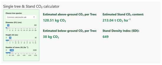 To test our results, we built a dashboard to estimate above- and belowground stock in forest stands. The tool avoids manual use of yield tables by implementing the published equations of Riedel and Kändler (2017) [18] within an R Studio application. It uses R-shiny for the interface, dplyr for data processing, and rBDAT for biomass estimation. Users can select tree species and adjust diameter, height, and stem count; the app then calculates tree- and stand-level storage, h/d ratios, and SDI. Two plausibility checks flag unrealistic h/d ratios and basal areas exceeding one hectare. The dashboard complements existing yield tables and provides a straightforward way of carrying out accounting for individual trees and forest stands. The dashboard can either be replicated by simply copying the code in the Appendix C and pasting it into an R-shiny document or online: https://easyco2estimation.shinyapps.io/shiny/, accessed on 10 October 2025.