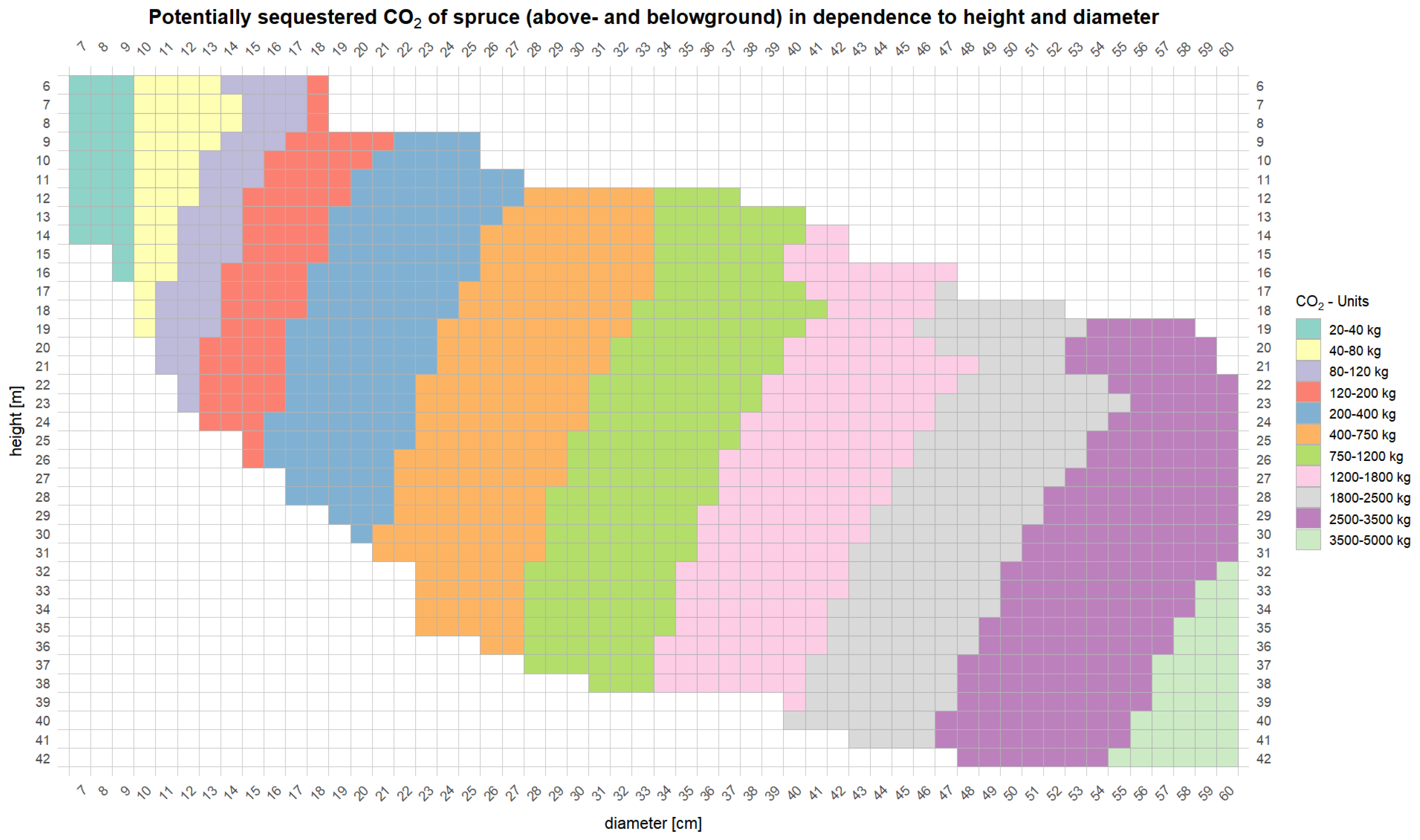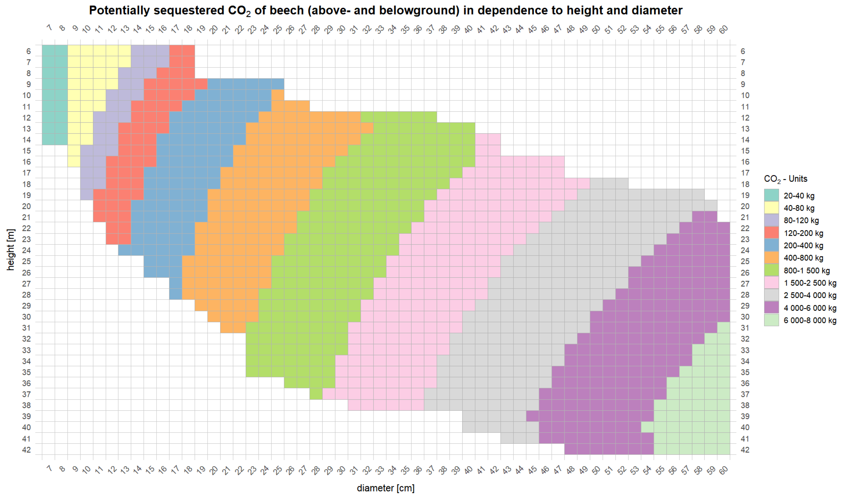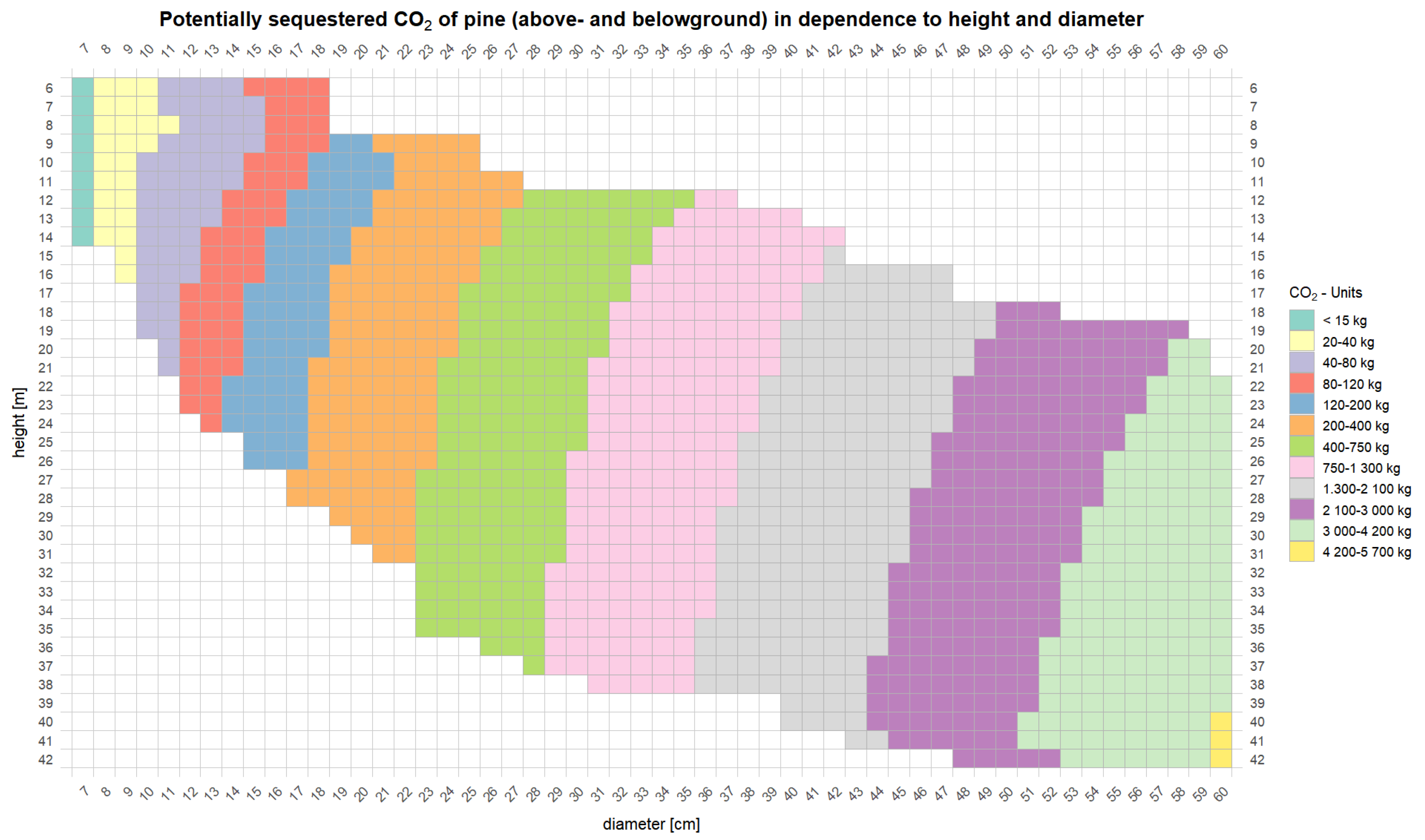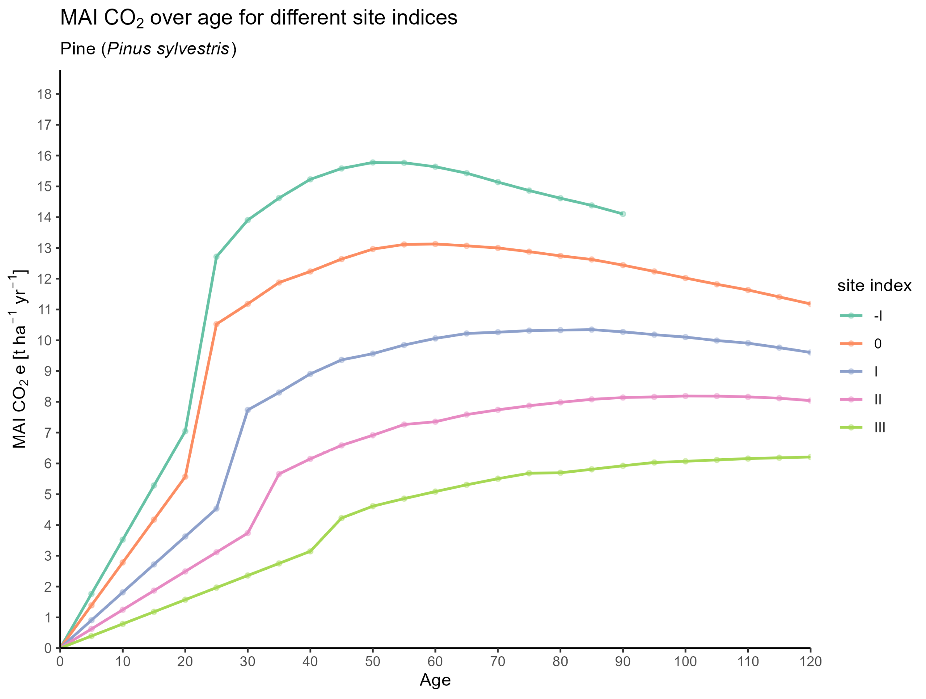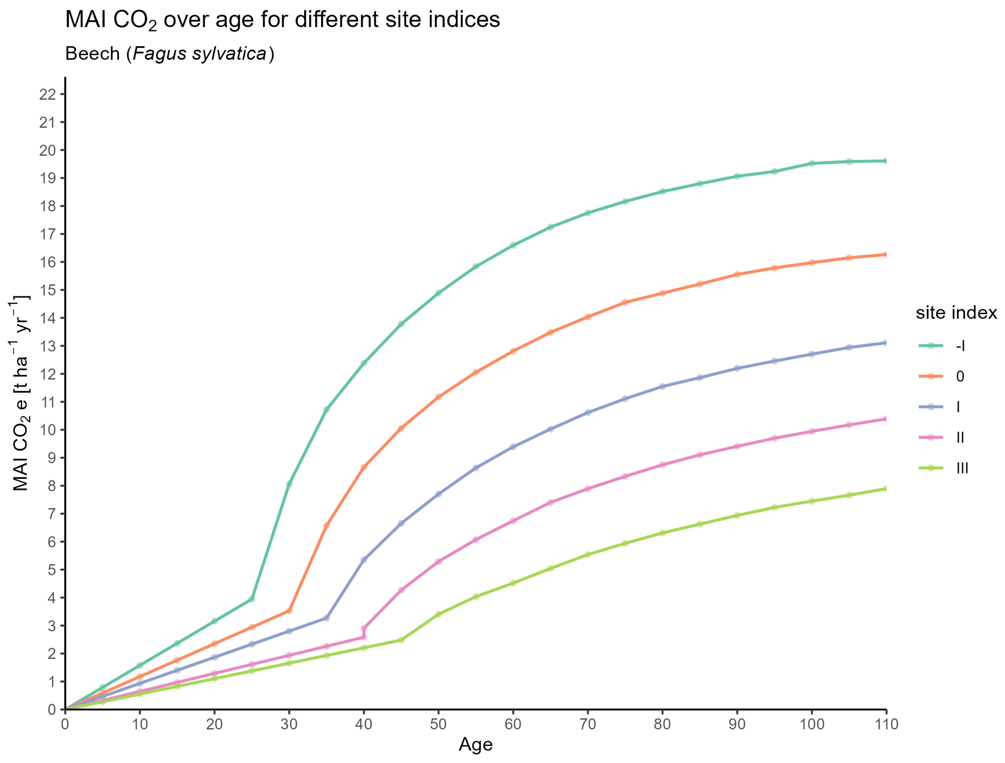 - MAI_CO2: Mean annual increment of potentially sequestered , in t .