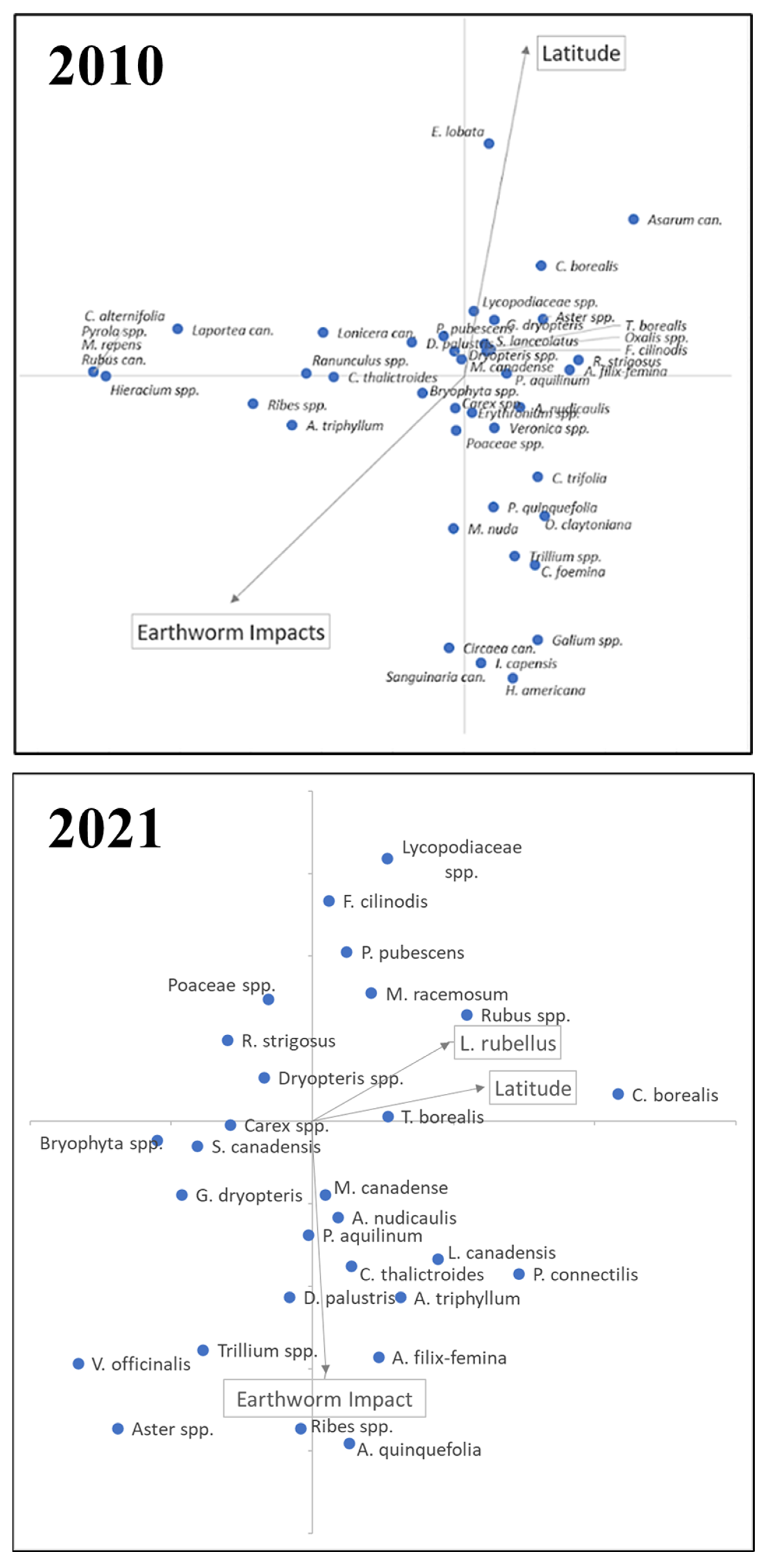 - Alexander, G.; Almendinger, J.; White, P. The long-term effects of invasive earthworms on plant community composition and diversity in a hardwood forest in northern Minnesota. Plant-Environ. Interact. 2022, 3, 89–102. [Google Scholar] [CrossRef] [PubMed]