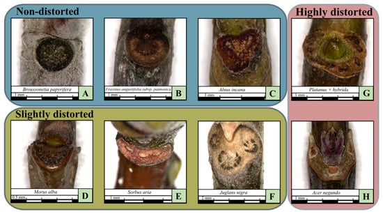 Main types and forms of leaf scars used in twig characterization: Not distorted by bud: round (A), oval (B), triangular (C); Slightly distorted: semicircle (D), crescent (E), heart (F); Highly distorted: ring (G), horseshoe (H).