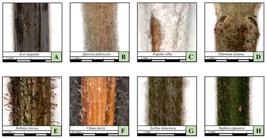 Trichome types used for twig characterization: Glabrous (A); Tomentose (B); Woolly (C); Pulverulent (D); Glandular (E); Sparse pilose (F); Dense pilose (G); Felted (H).