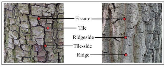 Terminology of tessellated (Crataegus spp.) (left) and deeply longitudinally fissured (Quercus cerris L.) (right) bark. Tessellated bark is characterized by horizontal cracks, unlike purely vertical fissured bark.