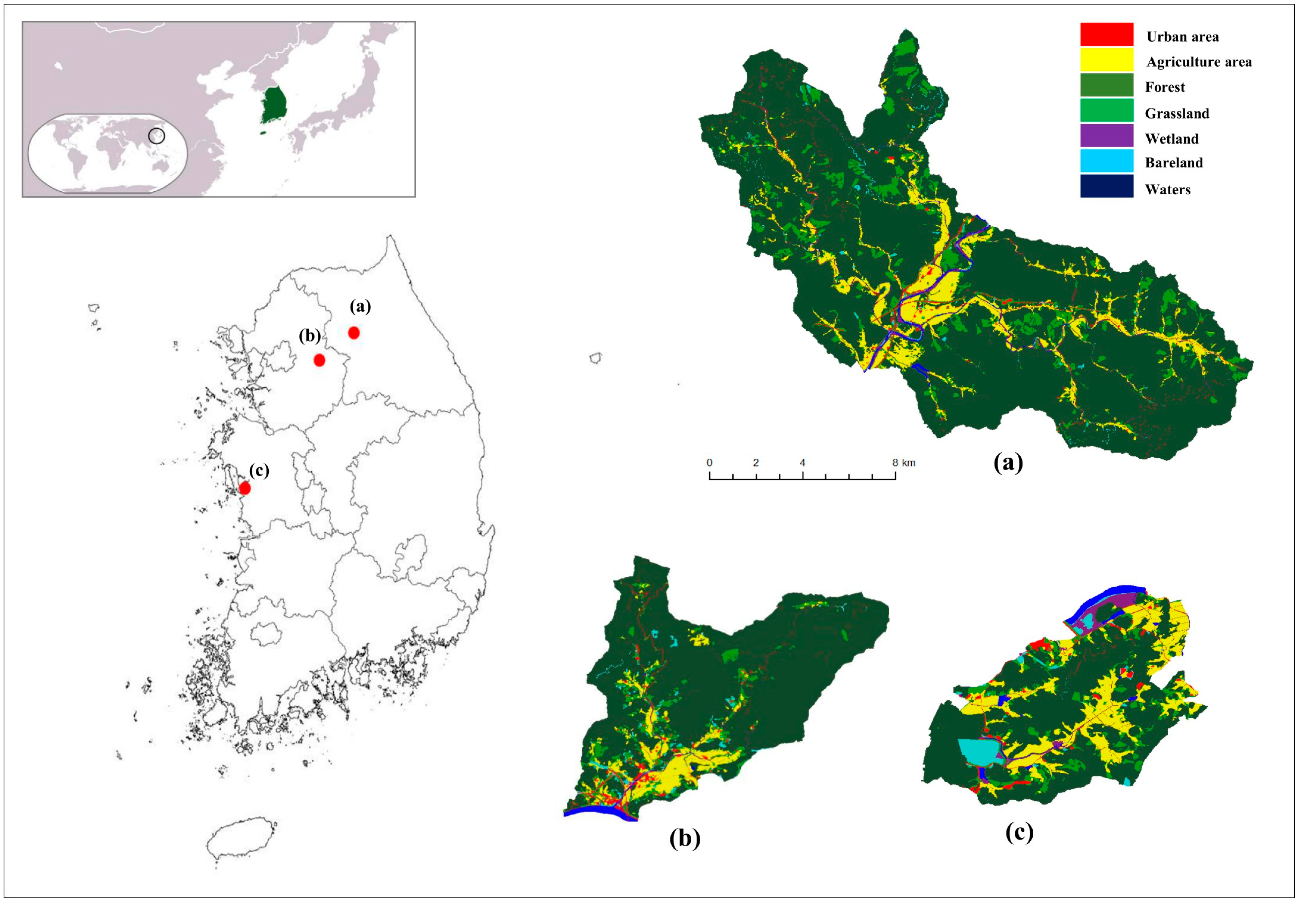 - Cho, H.J.; Kim, D.H.; Choi, J.D.; Chung, W.S.; Kim, H.J.; Lee, H.S.; Moon, U.K. Analysis of raccoon dog home range according to habitat environment [Abstract]. J. Korean Soc. Environ. Ecol. Conf. Proc. 2014, 2014, 35. [Google Scholar]