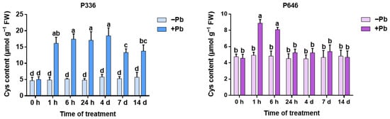 Effects of Pb on Cys content in two lead tolerant genotypes of S. integra. Two Salix integra clones (P336 and P646) were exposed to 300 μM Pb(NO3)2 for different durations (1 h, 6 h, 1 d, 4 d, 7 d, and 14 d), after which roots were collected to measure Cys content. Each treatment included three independent biological replicates, and error bars represent standard deviations (SD). Distinct letters represent statistically significant differences as determined by two-way ANOVA followed by Tukey’s multiple comparisons test (p < 0.05).