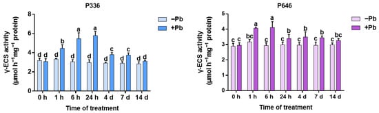 Effects of Pb on γ-ECS activity in two lead tolerant genotypes of S. integra. Two Salix integra clones (P336 and P646) were exposed to 300 μM Pb(NO3)2 for different durations (1 h, 6 h, 1 d, 4 d, 7 d, and 14 d), after which roots were collected to measure γ-ECS activity. Each treatment included three independent biological replicates, and error bars represent standard deviations (SD). Distinct letters represent statistically significant differences as determined by two-way ANOVA followed by Tukey’s multiple comparisons test (p < 0.05).