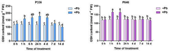 Effects of Pb on GSH content in two lead tolerant genotypes of S. integra. Two Salix integra clones (P336 and P646) were exposed to 300 μM Pb(NO3)2 for different durations (1 h, 6 h, 1 d, 4 d, 7 d, and 14 d), after which roots were collected to measure GSH content. Each treatment included three independent biological replicates, and error bars represent standard deviations (SD). Distinct letters represent statistically significant differences as determined by two-way ANOVA followed by Tukey’s multiple comparisons test (p < 0.05).