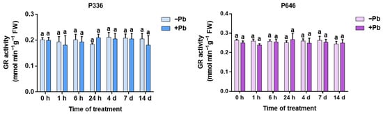 Effects of Pb on GR activity in two lead tolerant genotypes of S. integra. Two Salix integra clones (P336 and P646) were exposed to 300 μM Pb(NO3)2 for different durations (1 h, 6 h, 1 d, 4 d, 7 d, and 14 d), after which roots were collected to measure GR activity. Each treatment included three independent biological replicates, and error bars represent standard deviations (SD). Distinct letters represent statistically significant differences as determined by two-way ANOVA followed by Tukey’s multiple comparisons test (p < 0.05).