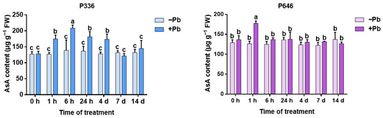 Effects of Pb on AsA content in two lead tolerant genotypes of S. integra. Two Salix integra clones (P336 and P646) were exposed to 300 μM Pb(NO3)2 for different durations (1 h, 6 h, 1 d, 4 d, 7 d, and 14 d), after which roots were collected to measure AsA content. Each treatment included three independent biological replicates, and error bars represent standard deviations (SD). Distinct letters represent statistically significant differences as determined by two-way ANOVA followed by Tukey’s multiple comparisons test (p < 0.05).