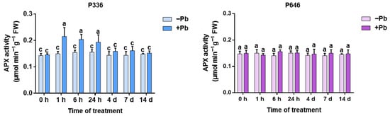 Effects of Pb on APX activity in two lead tolerant genotypes of S. integra. Two Salix integra clones (P336 and P646) were exposed to 300 μM Pb(NO3)2 for different durations (1 h, 6 h, 1 d, 4 d, 7 d, and 14 d), after which roots were collected to measure APX activity. Each treatment included three independent biological replicates, and error bars represent standard deviations (SD). Distinct letters represent statistically significant differences as determined by two-way ANOVA followed by Tukey’s multiple comparisons test (p < 0.05).