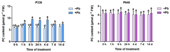 Effects of Pb on PC contents in two lead tolerant genotypes of S. integra. Two Salix integra clones (P336 and P646) were exposed to 300 μM Pb(NO3)2 for different durations (1 h, 6 h, 1 d, 4 d, 7 d, and 14 d), after which roots were collected to measure PC content. Each treatment included three independent biological replicates, and error bars represent standard deviations (SD). Distinct letters represent statistically significant differences as determined by two-way ANOVA followed by Tukey’s multiple comparisons test (p < 0.05).