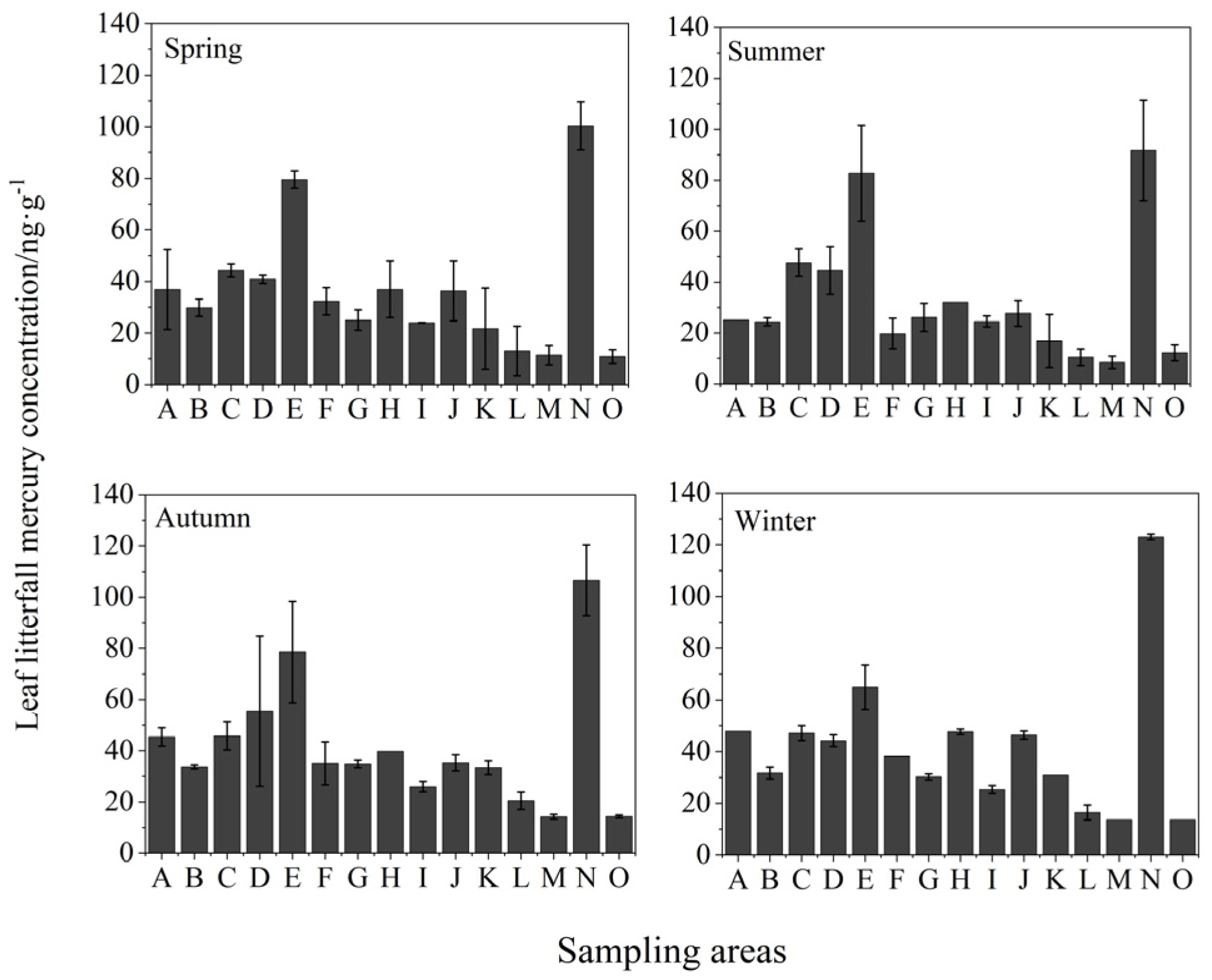 - Wang, Q.; Wang, Y.J.; Zhou, L.M.; Zheng, X.M. Temporal and spatial characteristics of mercury concentrations in leaves of common deciduous tree species in parks of Shanghai and its environmental implications. Environ. Chem. 2021, 40, 232–239. [Google Scholar]