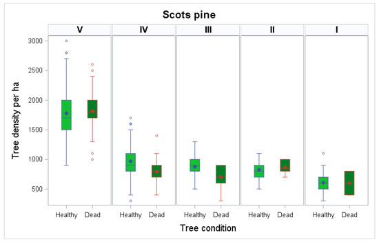 The effect of stand density on tree mortality was assessed separately for Scots pine and Norway spruce trees. Descriptive statistics (n, mean, SD) for each species × variant × condition (healthy/dead) group were calculated using PROC MEANS. The differences between healthy and dead individuals for each variant were checked using a two-sample t-test (PROC TEST) and one-way ANOVA (PROC GLM, Quantity × condition in each density variant). The PROC SGPANEL procedure was used for the visualizations.