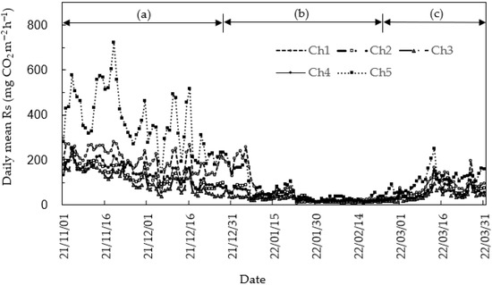 Seasonal change in daily mean soil respiration (Rs) at points from chamber 1 (Ch1) without litter to chamber 5 (Ch5) with a developed litter layer of about 12 cm. The Rs of each chamber was calculated as a daily average with two data points per hour. In here, cooling period (a; 1 November–31 December 2021) refers to the period from the beginning of the low Ts period until the lowest Ts reaches below zero, freezing period (b; 1 January–26 February 2022) refers to the period during which the lowest Ts remains below zero, and increasing temperature period (c; 27 February–31 March 2022) refers to the period during which the lowest Ts rises above zero.