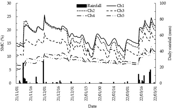 Most snowfall occurs during the freezing months of January and February; thus, the value may be inaccurate. Only a small amount of rainfall was recorded around 18 January 2022, but the soil moisture content (SMC) increased significantly from January 2022 (Figure 4). This is because the rain gauge could not convert the snowfall into rainfall. However, the increase in SMC can be used to estimate the amount of precipitation that fell as snow.