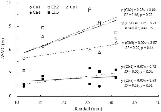 Seasonal variations in SMC showed that it remained relatively high during periods of high rainfall and, conversely, low during periods of low rainfall. Furthermore, SMC increased rapidly immediately after rainfall occurred and then gradually decreased after the rainfall ended (Figure 4). This rainfall dependence of SMC showed an irregular pattern that repeated itself depending on rainfall amounts. As the litter layer developed, ΔSMC showed lower values for the same rainfall (Figure 5). For example, at 25.5 mm of rainfall, SMC in Ch1 increased by 11.3%, but in Ch5, with a thick litter layer, it increased only by 1.6%. While the overall R2 value was not high, the chambers with developed litter layers were calculated to be lower than those without.
