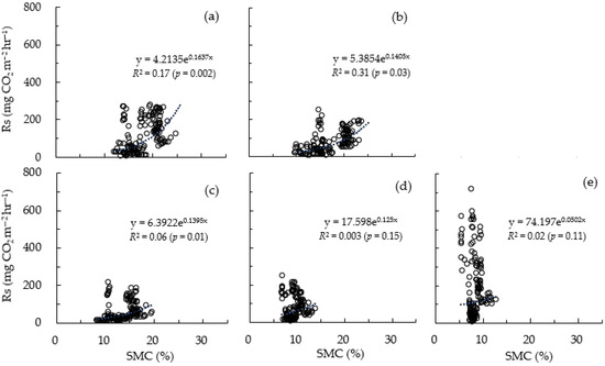 Relationship between soil respiration (Rs) and soil moisture content (SMC). (a–e) indicate from Chamber 1 to Chamber 5, respectively.