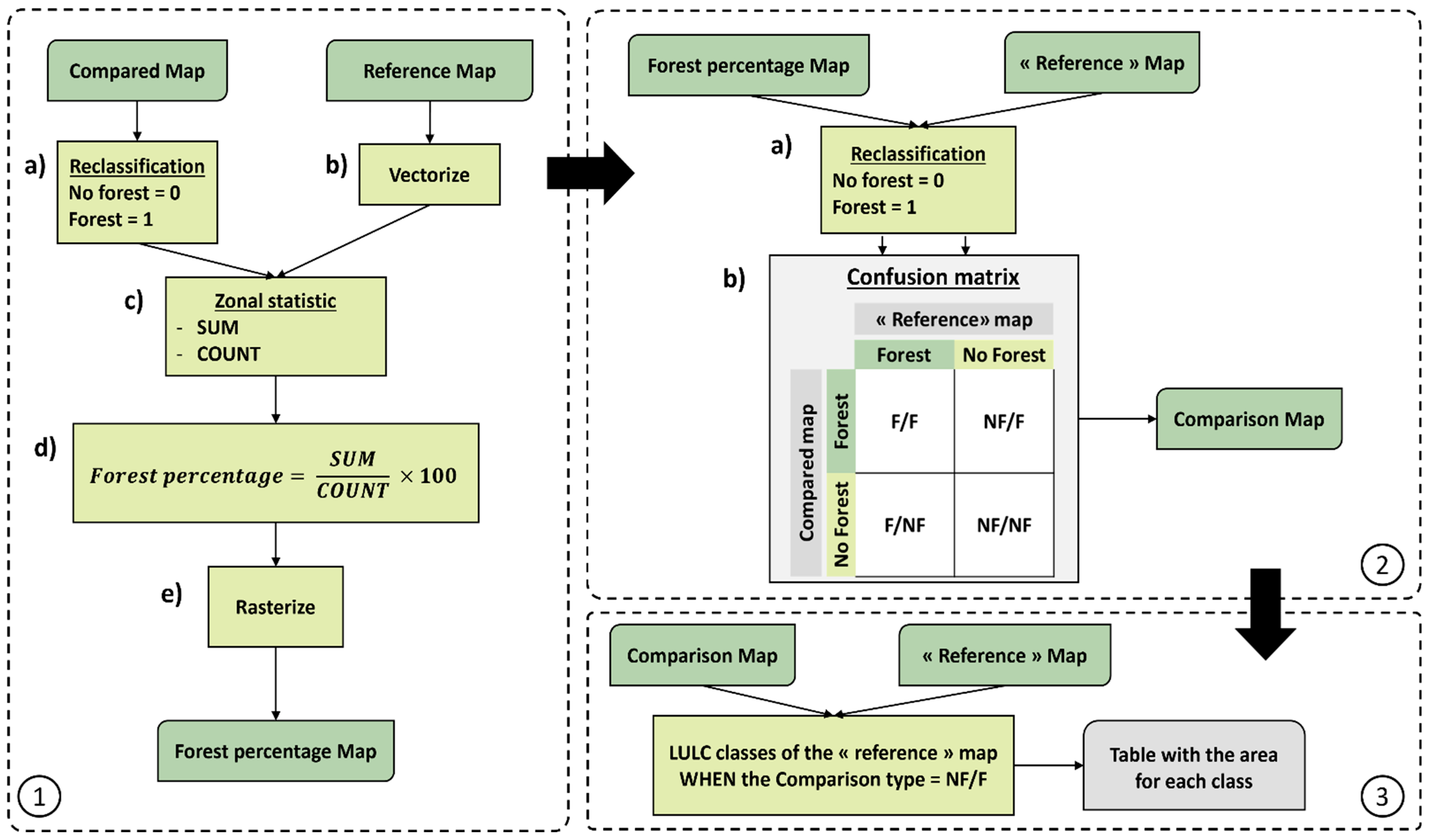 3.1. Impact of Data Homogenization and Resampling on Forest/Non-Forest Masks