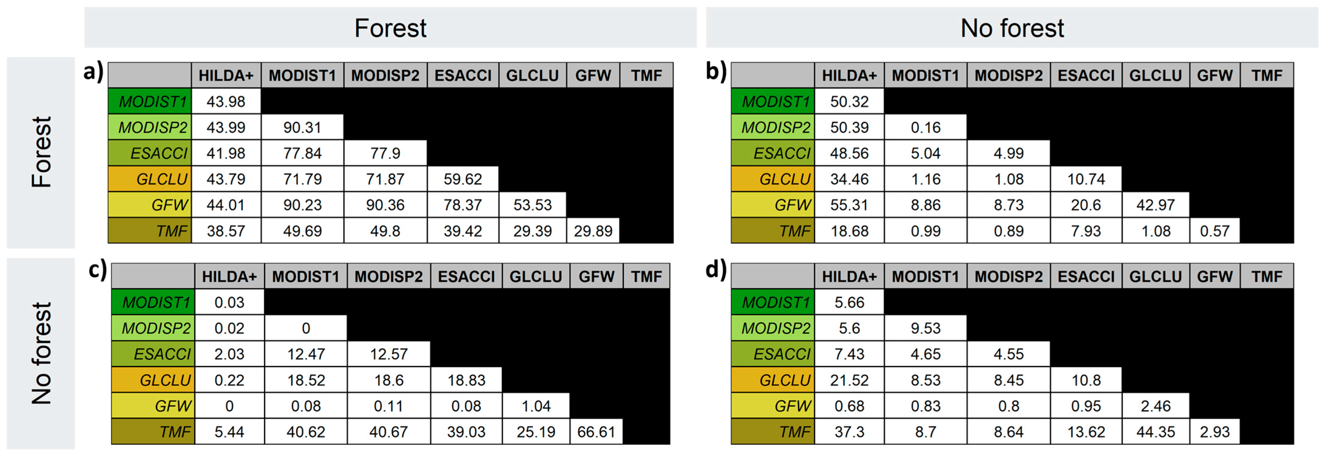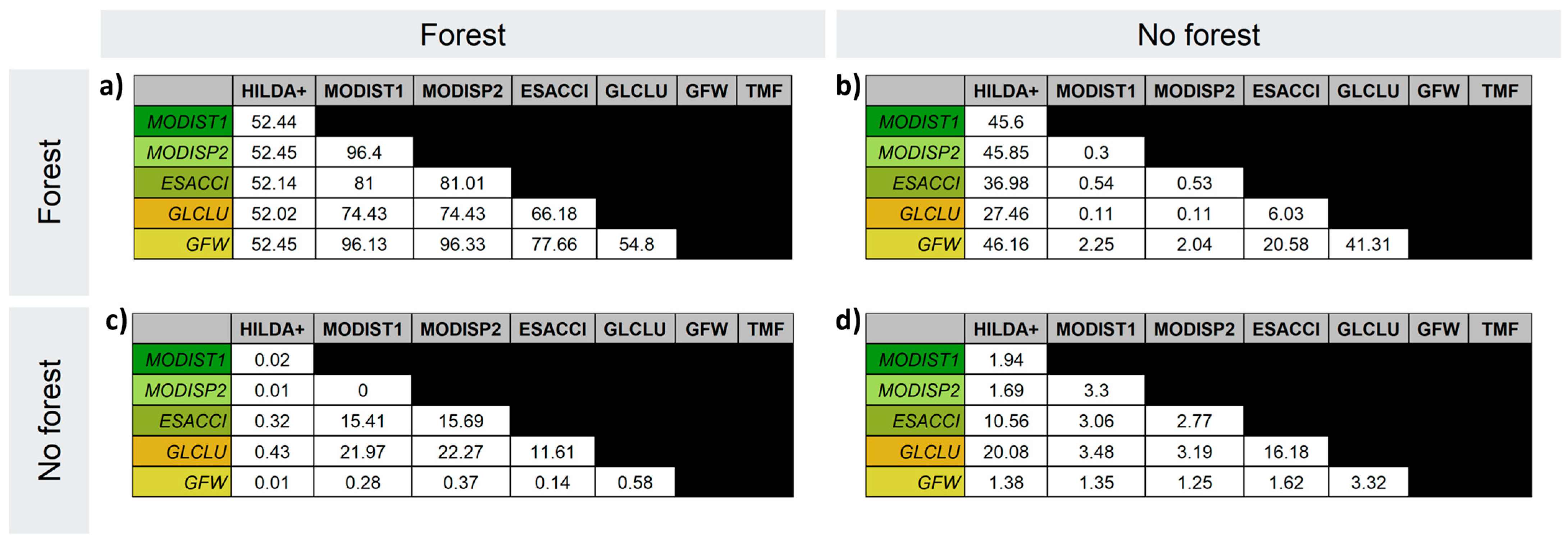3.2. Forest/Non-Forest Agreement and Disagreement Between Products