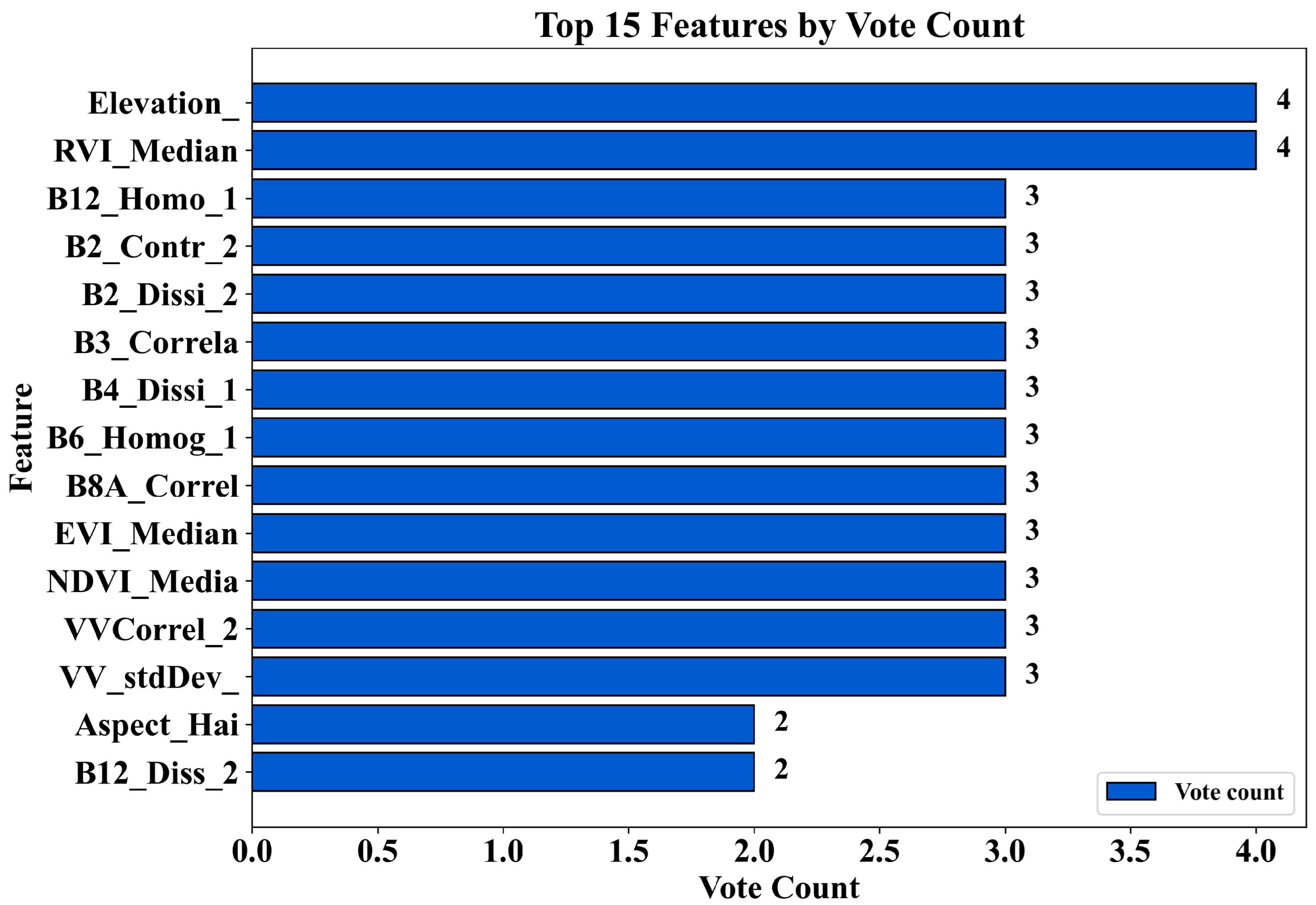 - Zhang, Y.; Liu, J.; Li, W.; Liang, S. A Proposed Ensemble Feature Selection Method for Estimating Forest Aboveground Biomass from Multiple Satellite Data. Remote Sens. 2023, 15, 1096. [Google Scholar] [CrossRef]