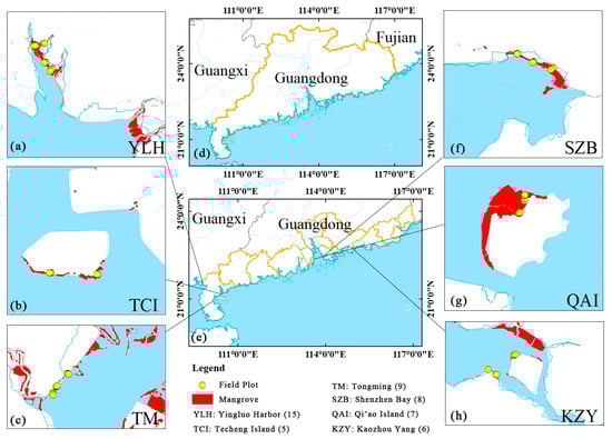 Distribution map of mangroves and locations of field plots in Guangdong Province, China. The yellow lines in (d,e) show the provincial boundary of Guangdong and the municipal borders in the coastal region of Guangdong, respectively. The yellow points in (a–c) and (f–h) show the field survey plots in Yingluo Harbor, Techeng Island, Tongming, Shenzhen Bay, Qi’ao Island, and Kaozhou Yang, respectively.