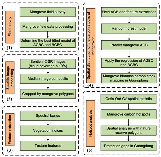 The flowchart showing the sequence of methods used in this study, from field survey to satellite image processing, estimation of mangrove biomass carbon stocks, detection of mangrove carbon hotspots, and identification of mangrove protection gaps. The numbers (1–5) in the figure show the sequence of data processing.