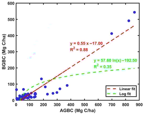 The scatterplot of mangrove aboveground biomass carbon (AGBC) and belowground biomass carbon (BGBC); the dashed red and green lines show the linear and logarithmic regression models, respectively.