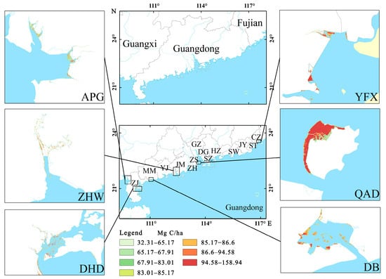 Spatial patterns of mangrove biomass carbon stock in Guangdong. APG = Anpu Gang, ZHW = Zhenhai Wan, DHD = Donghai Island, YFX = Yifengxi Estuary, QAD = Qi’ao Island, DB = Dianbai, Maoming. ZJ, MM, YJ, JM, ZH, ZS, GZ, DG, SZ, HZ, SW, YJ, ST, and CZ represent Zhanjiang, Yangjiang, Jiangmen, Zhuhai, Zhongshan, Guangzhou, Dongguan, Shenzhen, Huizhou, Shanwei, Yangjiang, Shantou, and Chaozhou, respectively.