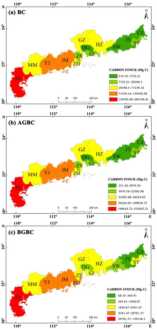Mangrove AGBC, BGBC, and BC in Guangdong Province.
