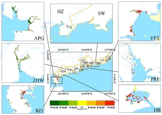 We constructed using the fixed distance method, and the threshold distance was set as 1000 m. As Clarke (1993) [57] has shown that most mangrove propagules are within 1 km of the origin, and mangroves are generally distributed along Guangdong coastlines in patchy patterns, a 1000 m threshold is suitable to describe the autocorrelation of mangrove ecosystems in Guangdong. The False Discovery Rate correction was also applied to ensure the accuracy of hotspot identification.