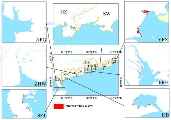 The mangrove protection gaps in terms of mangrove biomass carbon stocks in Guangdong.