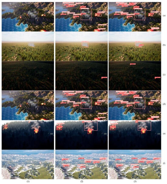 At the practical application level, DFE-YOLO’s lightweight design enables deployment on embedded airborne hardware platforms with limited computational power. When integrated with Jetson Xavier (produced by NVIDIA Corporation, Santa Clara, CA, USA) on typical drone platforms such as the DJI M300 RTK (manufactured by SZ DJI Technology Co., Ltd., Shenzhen, China), it can fulfill real-time monitoring requirements. Given typical drone endurance times (25–35 min), the system can continuously monitor approximately 10–15 square kilometers of forest during a single flight, identifying and localizing fires in their early stages to significantly enhance firefighting response efficiency. However, the model’s current computational complexity (11.2 GFLOPs) remains challenging for sustained high-performance computing on airborne platforms. However, on hardware with more constrained power consumption, such as the Jetson Nano (developed by NVIDIA Corporation, Santa Clara, CA, USA), frame rates may experience a reduction. Subsequent work will focus on optimizing model structure parallelism and hardware utilization, developing dynamic inference mechanisms that adapt computation paths based on image complexity. This approach will reduce computational overhead in simple scenarios, enabling the model to maintain lightweight characteristics while further accelerating inference speeds.