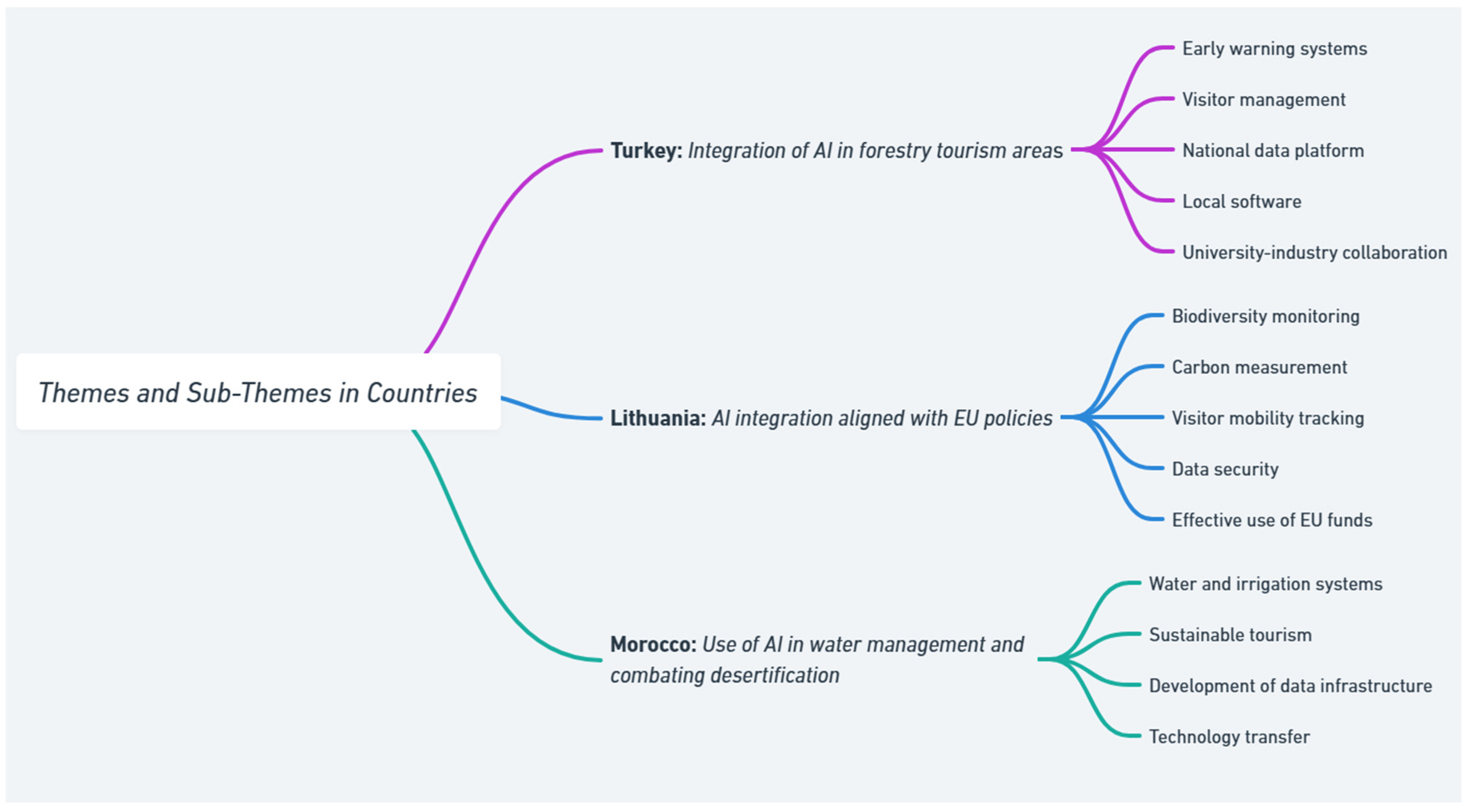 - To comparatively examine the use of AI in forestry within the tourism sector in Turkey, Lithuania, and Morocco, highlighting similarities and differences across countries.